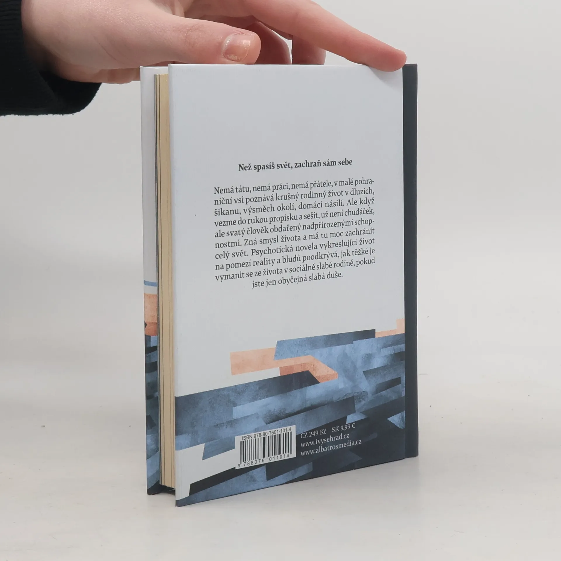Nemá tátu, nemá práci, nemá přátele, v malé pohraniční vsi poznává krušný rodinný život v dluzích, šikanu, výsměch okolí, domácí násilí. Ale když vezme do rukou propisku a sešit, už není chudáček, ale svatý člověk obdařený nadpřirozenými schopnostmi. Zná smysl života a má tu moc zachránit celý svět. Psychotická novela vykreslující život na pomezí reality a bludů poodkrývá, jak těžké je vymanit se ze života v sociálně slabé rodině, pokud jste jen obyčejná slabá duše.