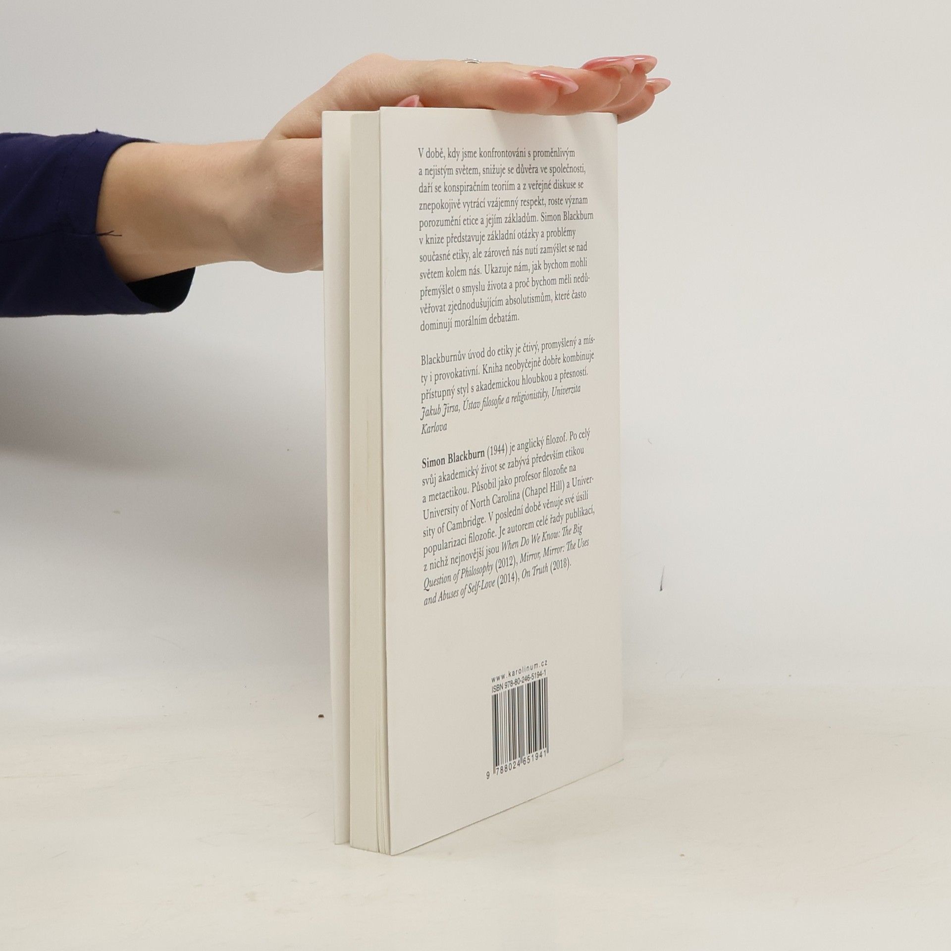 V době, kdy jsme konfrontováni s proměnlivým a nejistým světem, snižuje se důvěra ve společnosti, daří se konspiračním teoriím a z veřejné diskuse se znepokojivě vytrácí vzájemný respekt, roste význam porozumění etice a jejím základům. Simon Blackburn v knize představuje základní otázky a problémy současné etiky, ale zároveň nás nutí zamýšlet se nad světem kolem nás. Ukazuje nám, jak bychom mohli přemýšlet o smyslu života a proč bychom měli nedůvěřovat zjednodušujícím absolutismům, které často dominují morálním debatám.