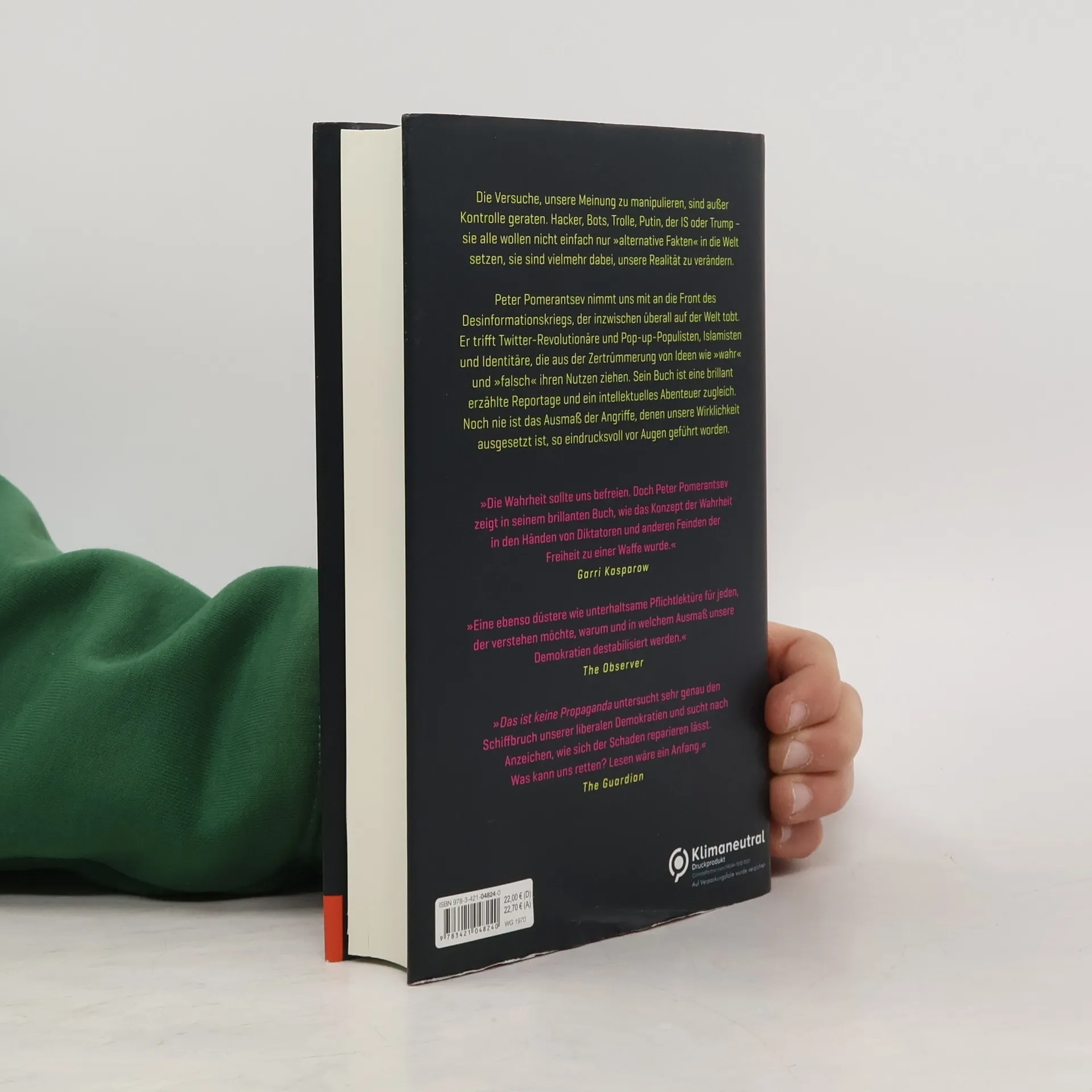 Wenn Informationen zur Waffe werden, befinden wir uns alle im Krieg Die Versuche, unsere Meinung zu manipulieren, sind außer Kontrolle geraten. Hacker, Bots, Trolle, Putin, der IS oder Trump – sie alle wollen nicht einfach nur »alternative Fakten« in die Welt setzen, sie sind vielmehr dabei, unsere Realität zu verändern. Peter Pomerantsev nimmt uns mit an die Front des Desinformationskrieges, der inzwischen überall auf der Welt tobt. Er trifft Twitter-Revolutionäre und Pop-up-Populisten, Islamisten und Identitäre, die aus der Zertrümmerung von Ideen wie »wahr« und »falsch« ihren Nutzen ziehen. Sein Buch ist eine brillant erzählte Reportage und ein intellektuelles Abenteuer zugleich. Unter anderem reiste Peter Pomerantsev in die Philippinen und interviewte dort die, mittlerweile mit dem Friedensnobelpreis ausgezeichnete Journalistin Maria Ressa und sprach mit ihr über den Kampf gegen Desinformation und über die Aufdeckung von Korruption. Noch nie ist das Ausmaß der Angriffe, denen unsere Wirklichkeit ausgesetzt ist, so eindrucksvoll vor Augen geführt worden.