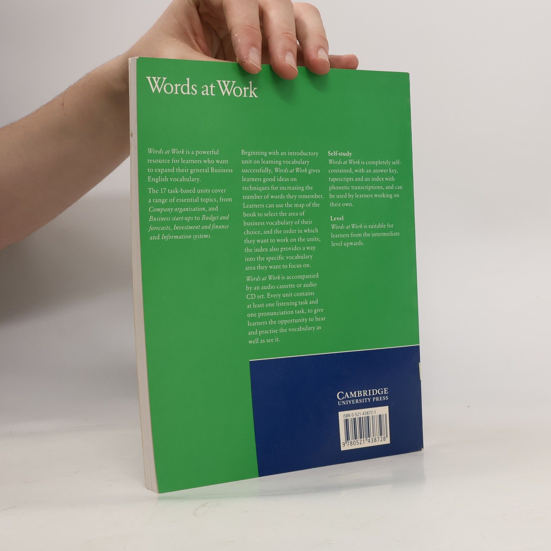 Words at Work is a powerful resource for learners who want to expand their vocabulary in order to use English more effectively in a general Business English context. The 17 task-based units cover a range of essential topics, from Company organisation and Advertising to Finance and Information systems. The introduction unit on learning vocabulary successfully gives learners good ideas on techniques for remembering more words. The index also provides a way in to the specific vocabulary area they want to focus on. Words at Work is accompanied by a listening cassette. Every unit contains at least one listening task and one pronunciation task, to give learners the opportunity to hear and practise the vocabulary as well as see it. Words at Work is completely self-contained, with an answer key, tapescripts and an index with phonetic transcriptions, and can be used by learners working on their own.