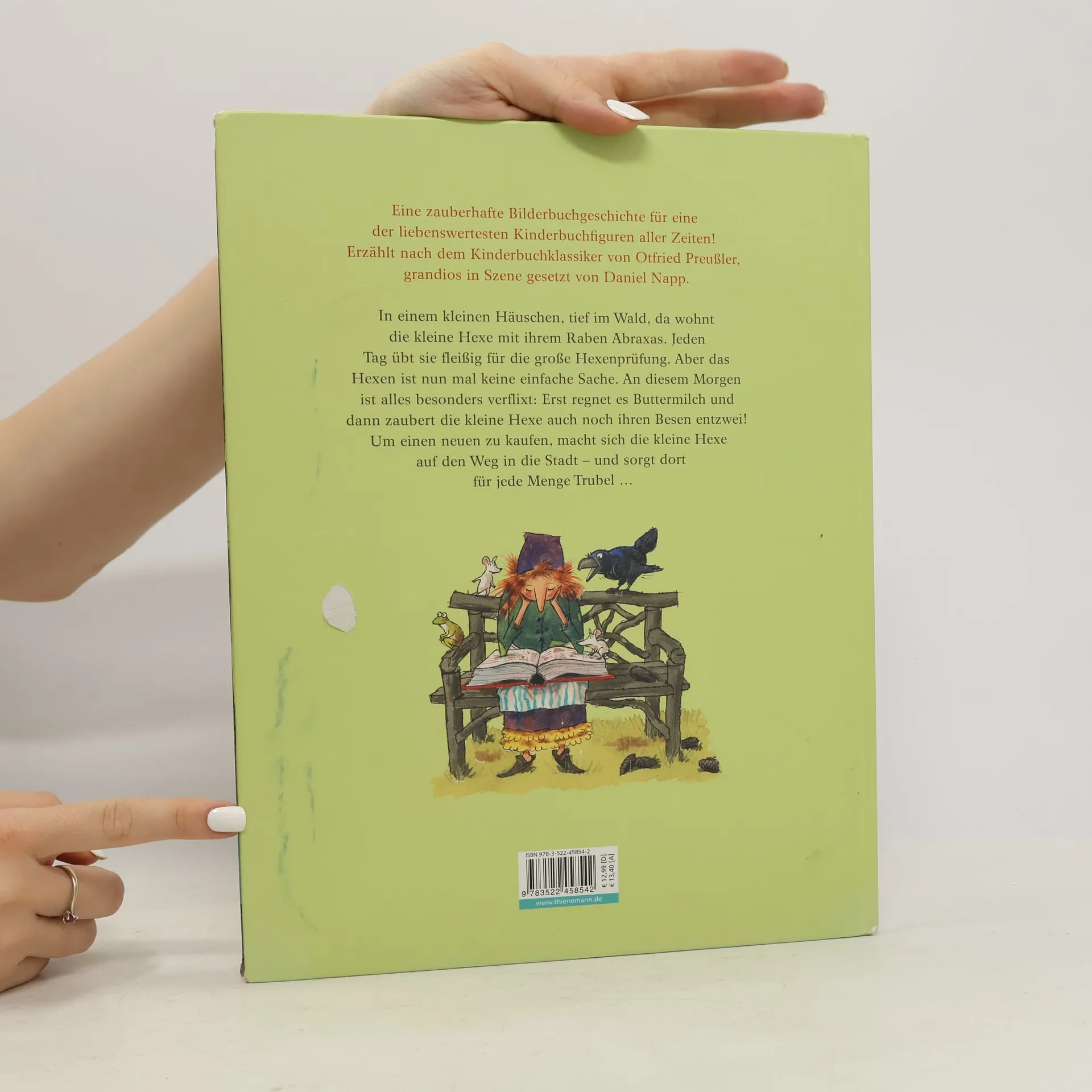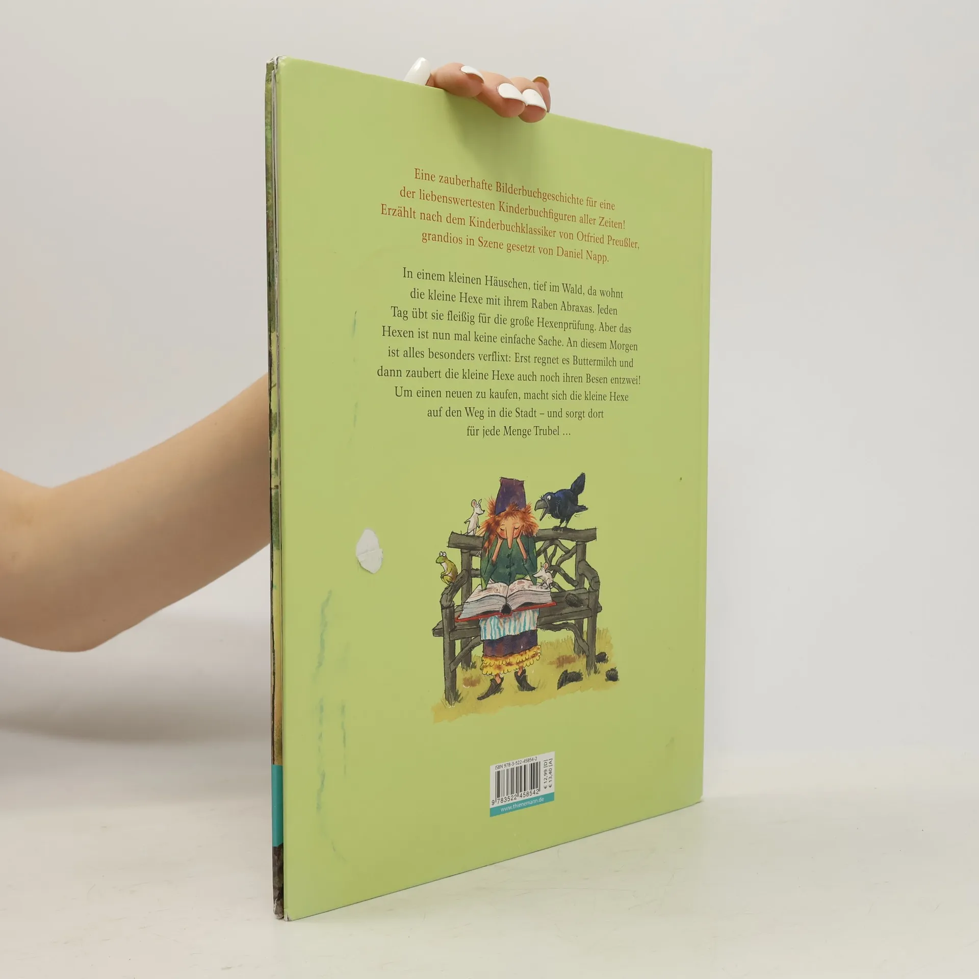 Eine zauberhafte Bilderbuchgeschichte für eine der liebenswertesten Kinderbuchfiguren aller Zeiten! Erzählt nach dem Kinderbuch-Klassiker von Otfried Preußler, grandios in Szene gesetzt von Daniel Napp, zum Vorlesen für Kinder ab 4 Jahren. In einem kleinen Häuschen, tief im Wald, da wohnt die kleine Hexe mit ihrem Raben Abraxas. Jeden Tag übt sie fleißig für die große Hexenprüfung. Aber das Hexen ist nun mal keine einfache Sache. An diesem Morgen ist alles besonders verflixt: Erst regnet es Buttermilch und dann zaubert die kleine Hexe auch noch ihren Besen entzwei! Um einen neuen zu kaufen, macht sich die kleine Hexe auf den Weg in die Stadt – und sorgt dort für jede Menge Trubel …