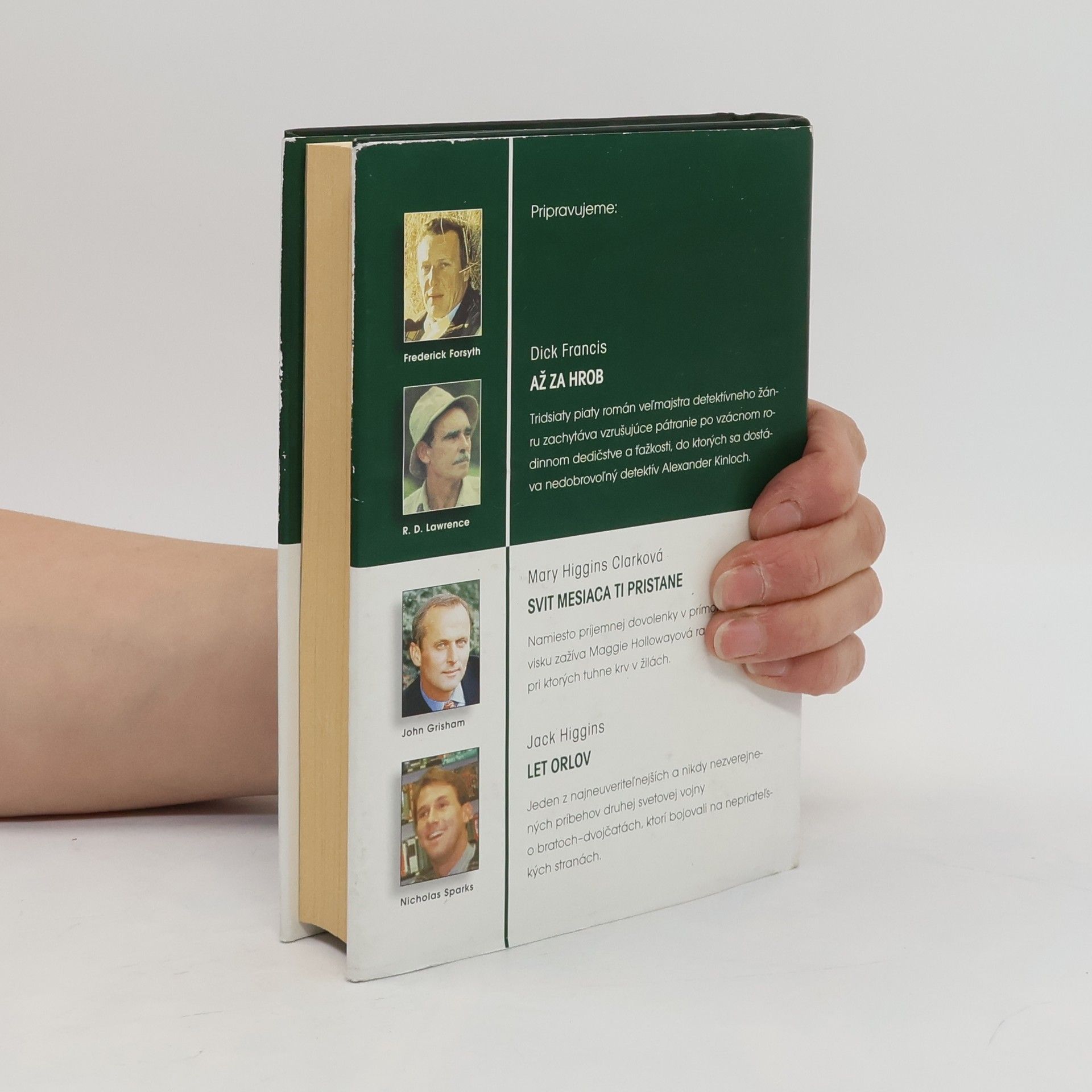 FORSYTH, FREDERICK - IKONA (Icon) - Rusko na prahu nového tisícročia, Rusko na križovatke. Nebezpečný fanatik sa derie k moci a Západ oficiálne nemôže nič robiť. Do samého stredu pekla však potajomky vyšlú bývalého agenta CIA. LAWRENCE, R. D. - BIELA PUMA - (The White Puma) - Mohutná mačka, ktorú napriek bielej srsti takmer nevidno, balansuje na skalisku vysoko v zasnežených horách západnej Kanady. Zovretým údolím o sedemsto metrov nižšie idú dvaja jazdci na koňoch. Nehybné, žlté pumie oči sa do nich vpíjajú - puma ich veľmi dobre pozná. Už jej zabili mamu aj sestru a teraz poľujú priamo na ňu. Lenže puma dnes pozoruje jazdcov, ktorí nič netušia. GRISHAM, JOHN - ADVOKÁT CHUDOBNÝCH (The Street Lawyer) - Zatemňuje sa azda Michaelovi Brockovi rozum ? Vždy si myslel, že vie, čo chce: elegantné obleky, luxusné autá, krásnu ženu a miliónový podiel vo firme. Lenže zrazu mu začalo záležať na voľačom inom. Už nechce robiť právnika len pre peniaze. Chce ho robiť pre pokoj vlastnej duše. SPARKS, NICHOLAS - ZÁPISNÍK (The Notebook) - Muž, ktorému leží na kolenách otvorený zápisník, zožltnutý a ohmataný. Žena, stratená a vystrašená, ktorá si uchovala len úbohé zlomky spomienok na vzácnu lásku. Ale potom jej on začína predčítať.