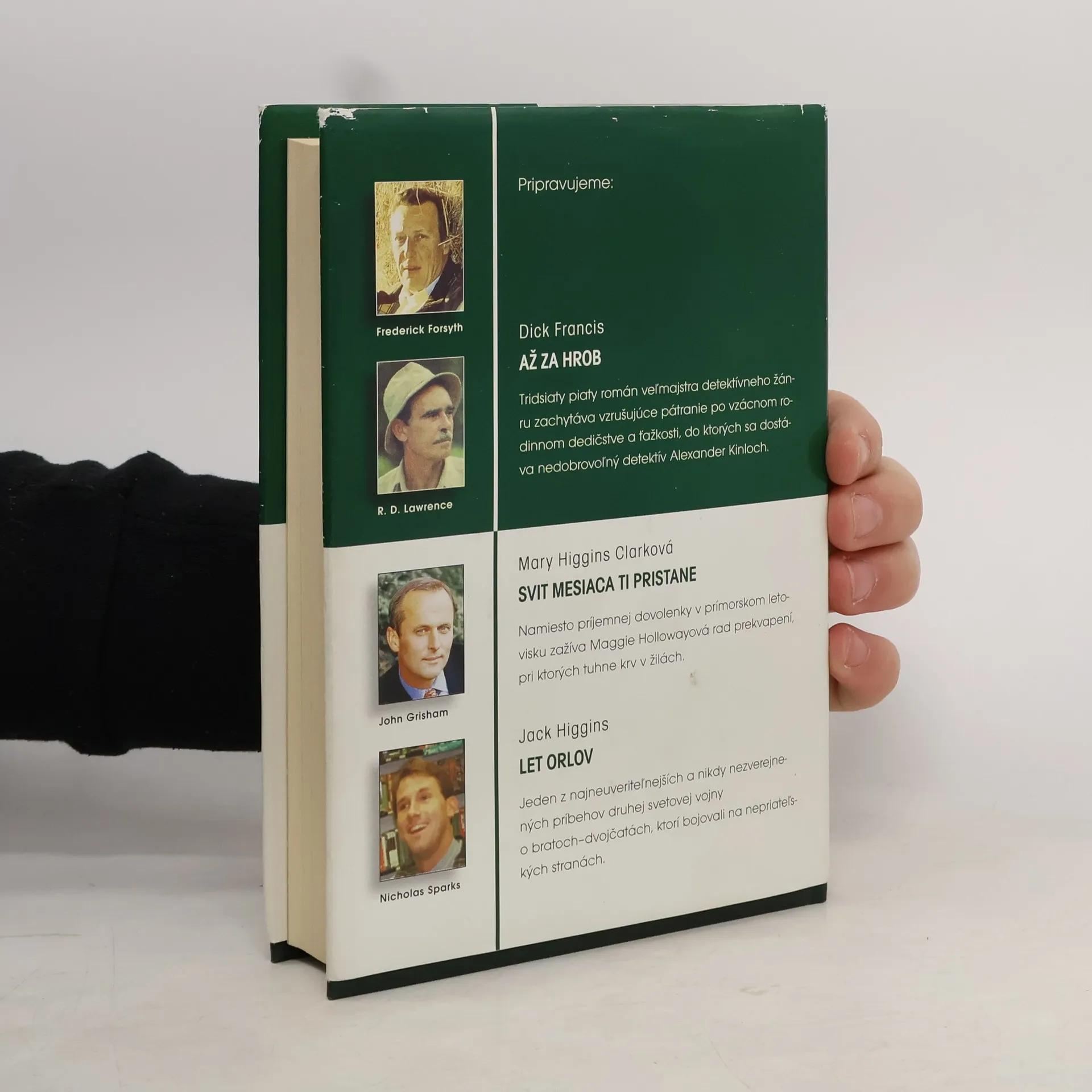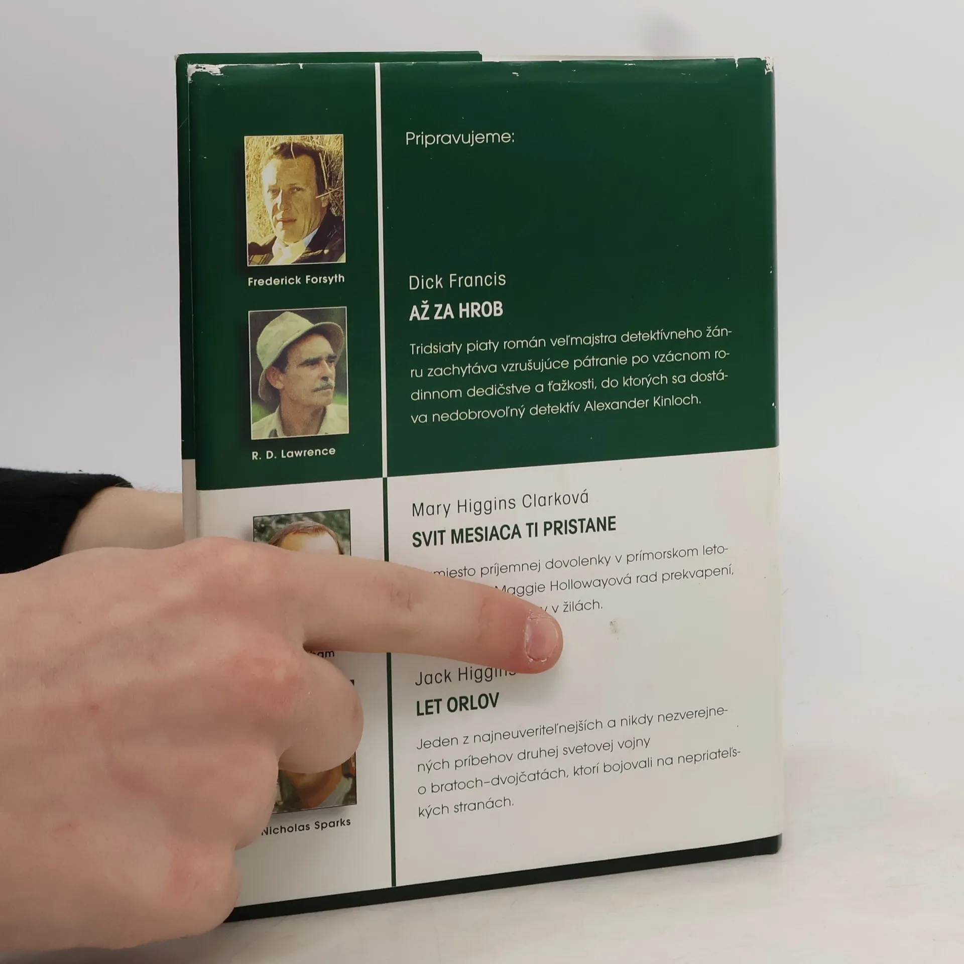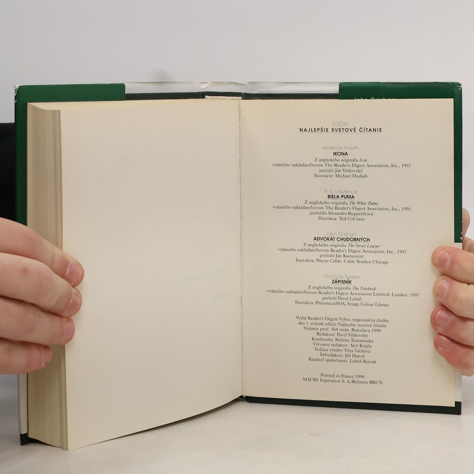FORSYTH, FREDERICK - IKONA (Icon) - Rusko na prahu nového tisícročia, Rusko na križovatke. Nebezpečný fanatik sa derie k moci a Západ oficiálne nemôže nič robiť. Do samého stredu pekla však potajomky vyšlú bývalého agenta CIA. LAWRENCE, R. D. - BIELA PUMA - (The White Puma) - Mohutná mačka, ktorú napriek bielej srsti takmer nevidno, balansuje na skalisku vysoko v zasnežených horách západnej Kanady. Zovretým údolím o sedemsto metrov nižšie idú dvaja jazdci na koňoch. Nehybné, žlté pumie oči sa do nich vpíjajú - puma ich veľmi dobre pozná. Už jej zabili mamu aj sestru a teraz poľujú priamo na ňu. Lenže puma dnes pozoruje jazdcov, ktorí nič netušia. GRISHAM, JOHN - ADVOKÁT CHUDOBNÝCH (The Street Lawyer) - Zatemňuje sa azda Michaelovi Brockovi rozum ? Vždy si myslel, že vie, čo chce: elegantné obleky, luxusné autá, krásnu ženu a miliónový podiel vo firme. Lenže zrazu mu začalo záležať na voľačom inom. Už nechce robiť právnika len pre peniaze. Chce ho robiť pre pokoj vlastnej duše. SPARKS, NICHOLAS - ZÁPISNÍK (The Notebook) - Muž, ktorému leží na kolenách otvorený zápisník, zožltnutý a ohmataný. Žena, stratená a vystrašená, ktorá si uchovala len úbohé zlomky spomienok na vzácnu lásku. Ale potom jej on začína predčítať.