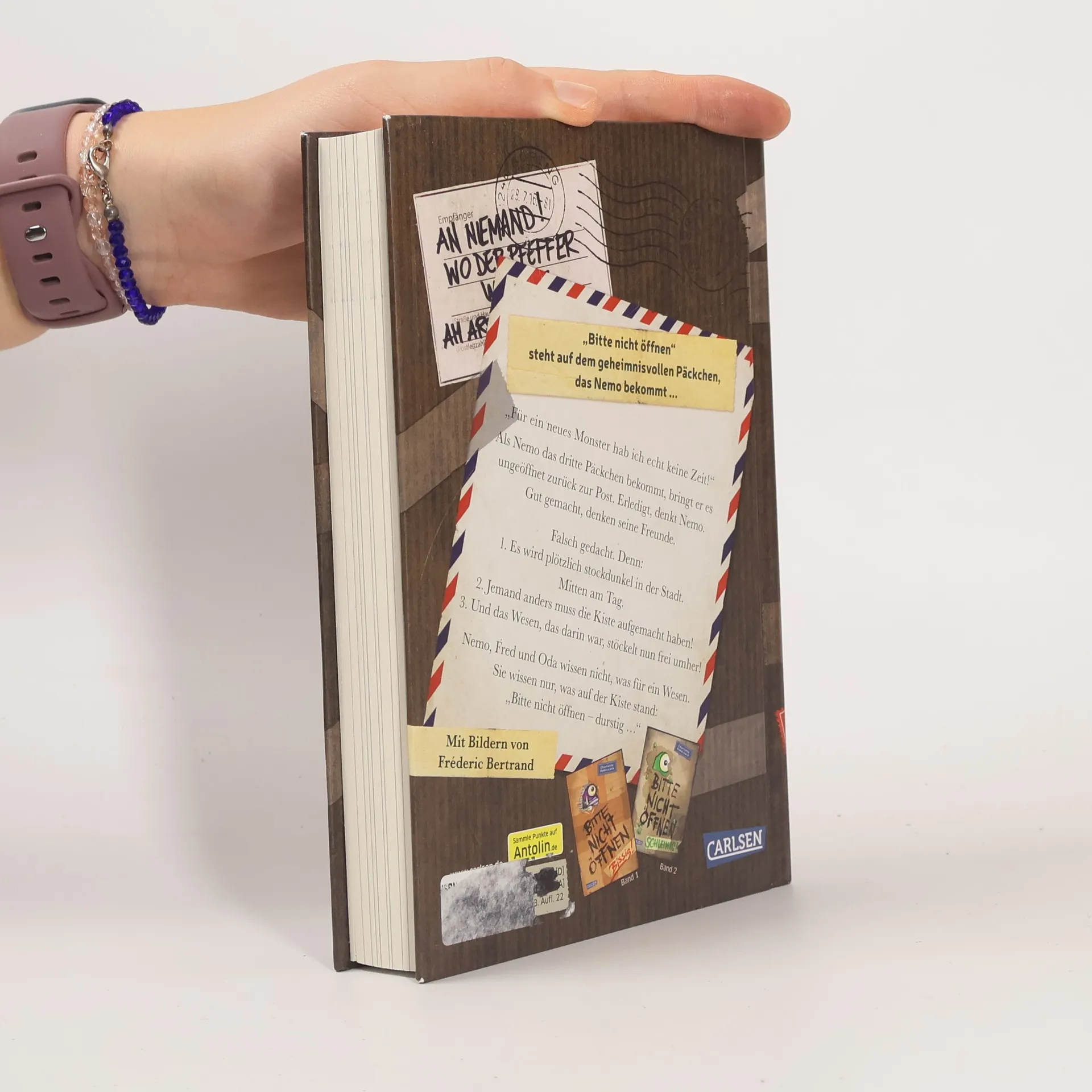 "Bitte nicht öffnen!" steht auf dem geheimnisvollen Päckchen, das Nemo bekommt. Also macht Nemo es auf ...BITTE NICHT ÖFFNEN, BAND 3: „Für ein neues Monster hab ich echt keine Zeit!“ Als Nemo das dritte Päckchen bekommt, bringt er es ungeöffnet zurück zur Post. Erledigt, denkt Nemo. Gut gemacht, denken seine Freunde. Falsch gedacht. Denn: 1. Es wird plötzlich stockdunkel in der Stadt. Mitten am Tag.2. Jemand anders muss die Kiste aufgemacht haben!3. Und das Wesen, das darin war, stöckelt nun frei umher!Nemo, Fred und Oda wissen nicht, was für ein Wesen. Sie wissen nur, was auf der Kiste stand: „Bitte nicht öffnen – durstig …“Nach dem Kinderbuch-Bestseller-Erfolg von Band 1 und 2 nun endlich da: ein neues lustiges und turbulentes Abenteuer rund um Schule, Freundschaft und ein verlorenes Wesen, das nach Hause will! ***Voller überraschender Wendungen, Sprachwitz und mit vielen Bildern vom unverwechselbaren Fréderic Bertrand. ***Das perfekte Buch für Jungs und Mädchen – und ihre Eltern! ***