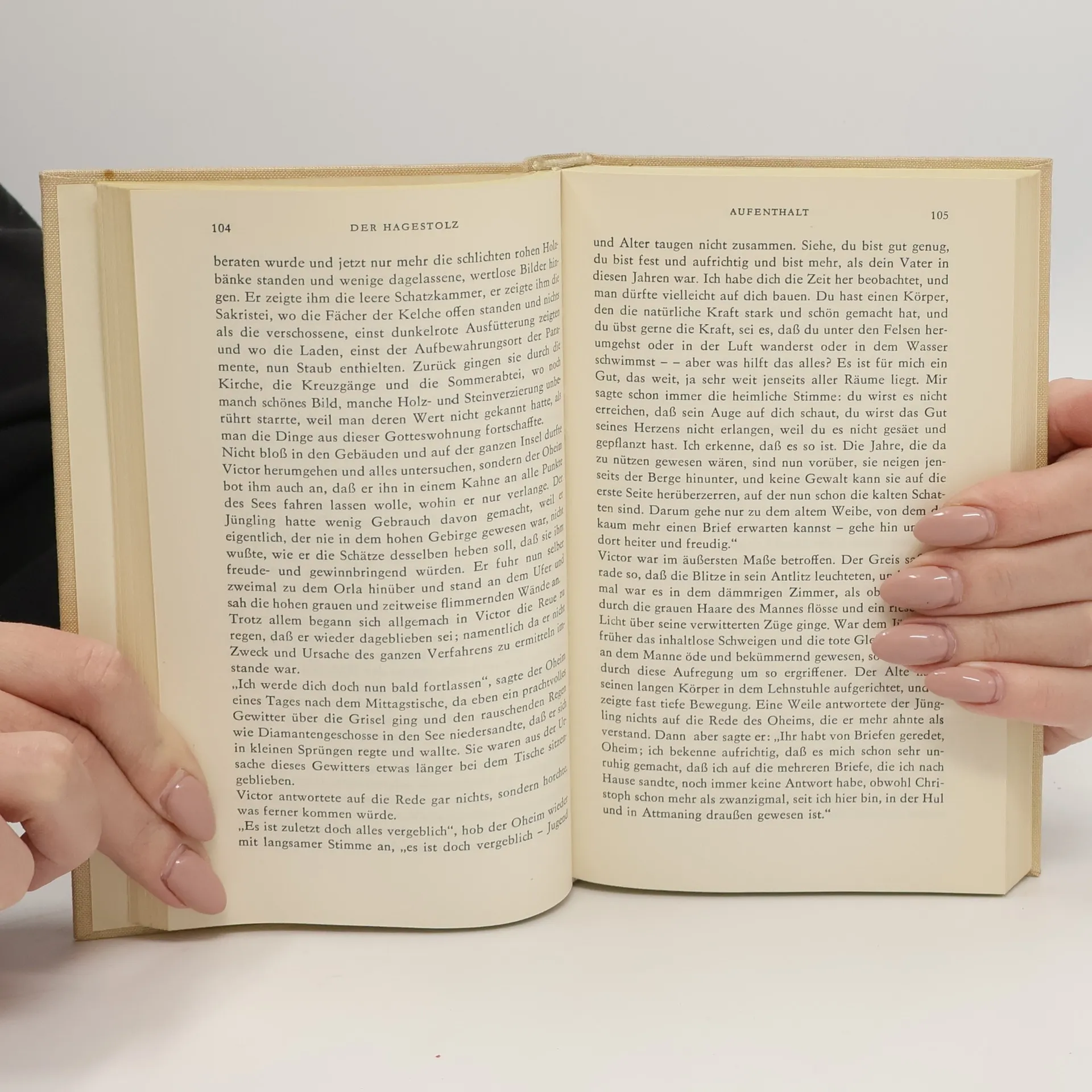In den Schicksalen der beiden Hauptfiguren, dem jungen Victor und seinem Oheim, dem auf einer weltabgeschiedenen Insel hausenden Hagestolz, führt Stifters Novelle zwei gegensätzliche Lebensauffassungen vor, die in Bild und Gegenbild die daseinsbestimmenden Gegensätze von Ruhe und Bewegung, von Licht und Finsternis, von Offenheit und Geschlossenheit veranschaulichen.