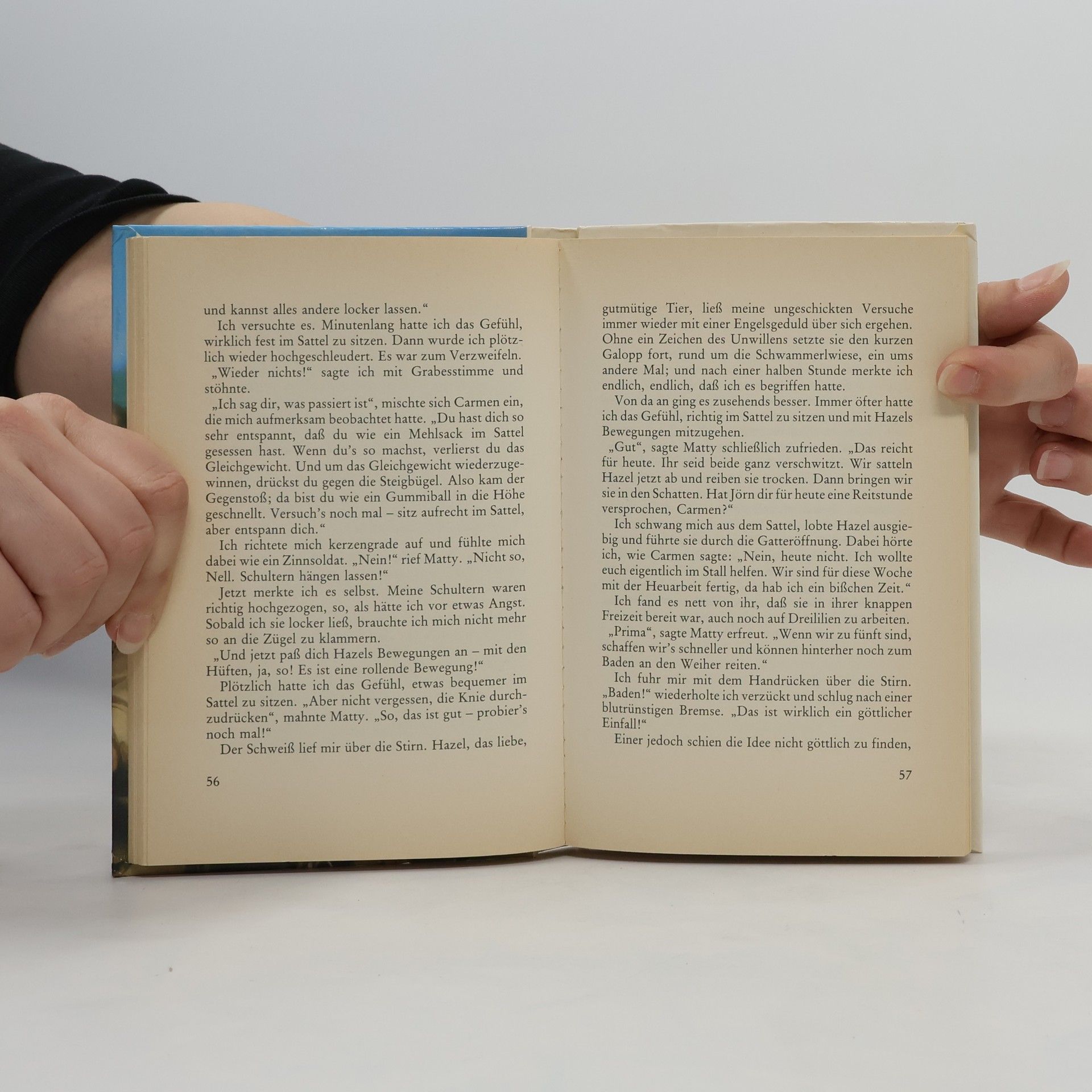"Im blassen Mondlicht liegt die umzäunte Koppel da. Ich gehe langsam weiter - da steht plötzlich eine zierliche, rotbraune Stute am Zaun und sieht mir mit großen Augen entgegen. Mein Herz klopft, das ist die erste Begegnung mit einem Pferd, das ich ganz allein versorgen werde...