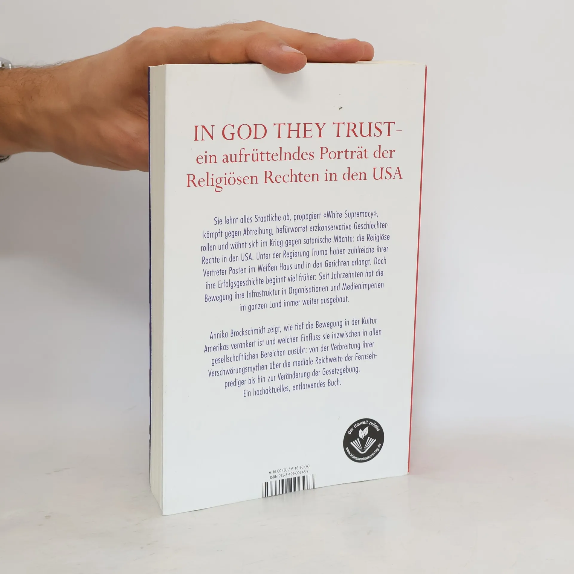 Sie lehnen alles Staatliche ab, propagieren „White-Supremacy“, kämpfen gegen Abtreibung, befürworten erzkonservative Geschlechterrollen und wähnen sich im Krieg gegen satanische Mächte: die Religiöse Rechte in den USA. Seit Jahrzehnten baut diese Bewegung ihre landesweite Infrastruktur aus Organisationen und Medienimperien immer weiter auf, unter der Regierung Trump konnten zahlreiche ihrer Vertreter Posten im Weißen Haus und in den Gerichten besetzen. Annika Brockschmidt geht der Geschichte der heutigen Religiösen Rechten in den USA von den 1960er Jahren bis heute nach und entfaltet das Spektrum einer vielschichtigen Gruppierung, die mittlerweile über Sieg und Niederlage bei Präsidentschaftswahlen entscheiden kann - und den Ton in einer der beiden großen Parteien des Landes angibt. Sie deckt ihre politische Agenda auf und zeigt, wie Geschichtsrevisionismus, Nationalismus, Autoritarismus, Verschwörungsdenken, Apokalypse-Sehnsucht und Rassismus die Religiöse Rechte von Beginn an geprägt haben. Ihre Vertreter sind heute längst im Zentrum der Macht angekommen. Trumps Niederlage war nicht das Ende der Religiösen Rechten in den USA – genauso wenig, wie seine Präsidentschaft ihr Beginn war.