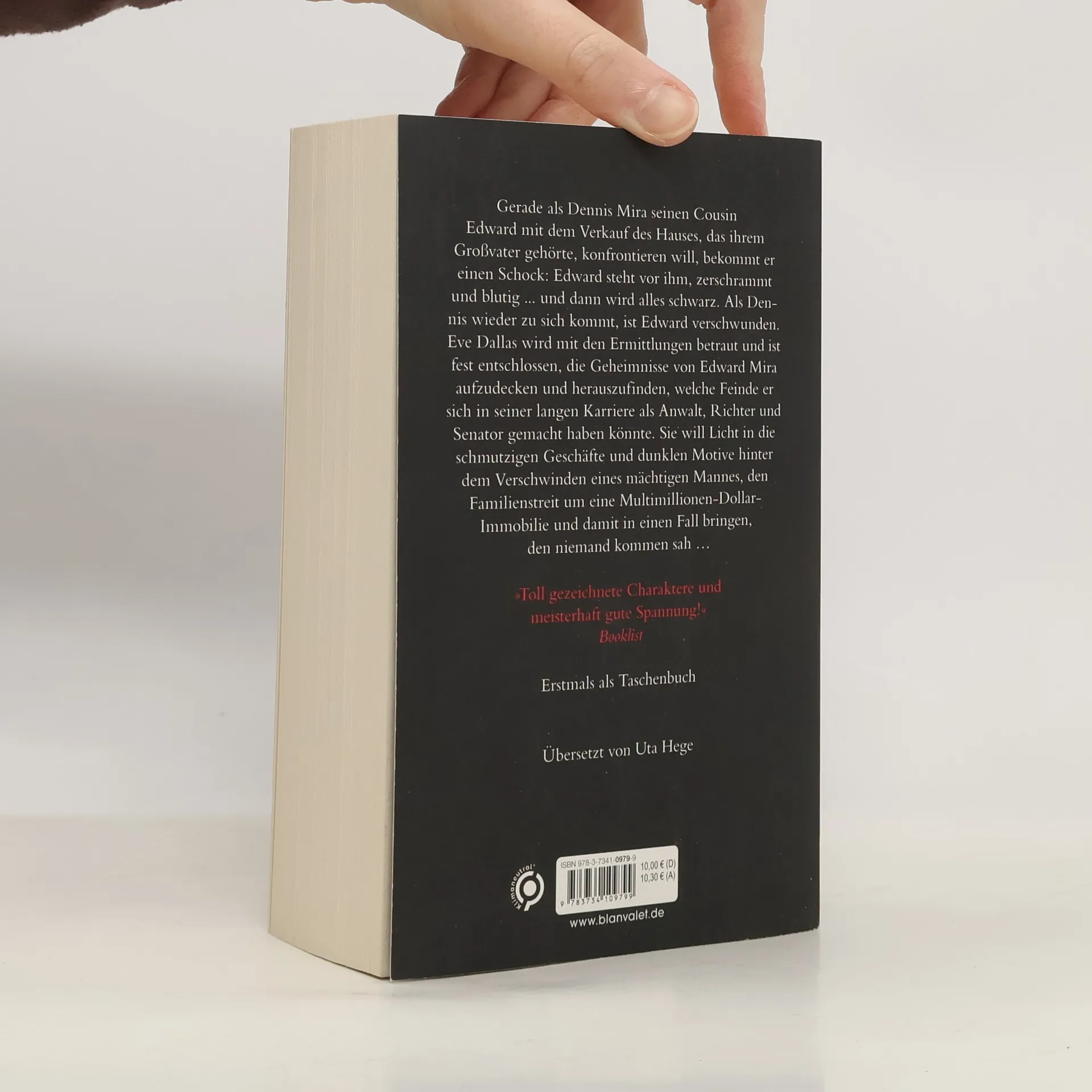 In ihrem 42. Fall muss Eve Dallas sich ihren eigenen Dämonen stellen und in einem atemberaubenden Wettlauf einen Mörder aufhalten … Gerade als Dennis Mira seinen Cousin Edward mit dem Verkauf des Hauses, das ihrem Großvater gehörte, konfrontieren will, bekommt er einen Schock: Edward steht vor ihm, zerschrammt und blutig ... und dann wird alles schwarz. Als Dennis wieder zu sich kommt, ist Edward verschwunden. Eve Dallas wird mit den Ermittlungen betraut und ist fest entschlossen, die Geheimnisse von Edward Mira aufzudecken und herauszufinden, welche Feinde er sich in seiner langen Karriere als Anwalt, Richter und Senator gemacht haben könnte. Sie will Licht in die schmutzigen Geschäfte und dunklen Motive hinter dem Verschwinden eines mächtigen Mannes, den Familienstreit um eine Multimillionen-Dollar-Immobilie und damit in einen Fall bringen, den niemand kommen sah … J. D. Robb übertrifft sich mit jedem Band ihrer SPIEGEL-Bestsellerserie erneut: Verpassen Sie nicht die anderen Fälle von Eve Dallas! Alle Roman sind unabhängig voneinander lesbar.