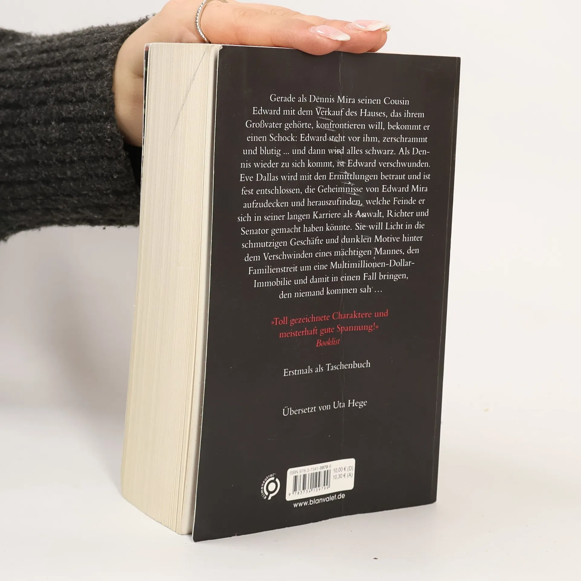 In ihrem 42. Fall muss Eve Dallas sich ihren eigenen Dämonen stellen und in einem atemberaubenden Wettlauf einen Mörder aufhalten … Gerade als Dennis Mira seinen Cousin Edward mit dem Verkauf des Hauses, das ihrem Großvater gehörte, konfrontieren will, bekommt er einen Schock: Edward steht vor ihm, zerschrammt und blutig ... und dann wird alles schwarz. Als Dennis wieder zu sich kommt, ist Edward verschwunden. Eve Dallas wird mit den Ermittlungen betraut und ist fest entschlossen, die Geheimnisse von Edward Mira aufzudecken und herauszufinden, welche Feinde er sich in seiner langen Karriere als Anwalt, Richter und Senator gemacht haben könnte. Sie will Licht in die schmutzigen Geschäfte und dunklen Motive hinter dem Verschwinden eines mächtigen Mannes, den Familienstreit um eine Multimillionen-Dollar-Immobilie und damit in einen Fall bringen, den niemand kommen sah … J. D. Robb übertrifft sich mit jedem Band ihrer SPIEGEL-Bestsellerserie erneut: Verpassen Sie nicht die anderen Fälle von Eve Dallas! Alle Roman sind unabhängig voneinander lesbar.