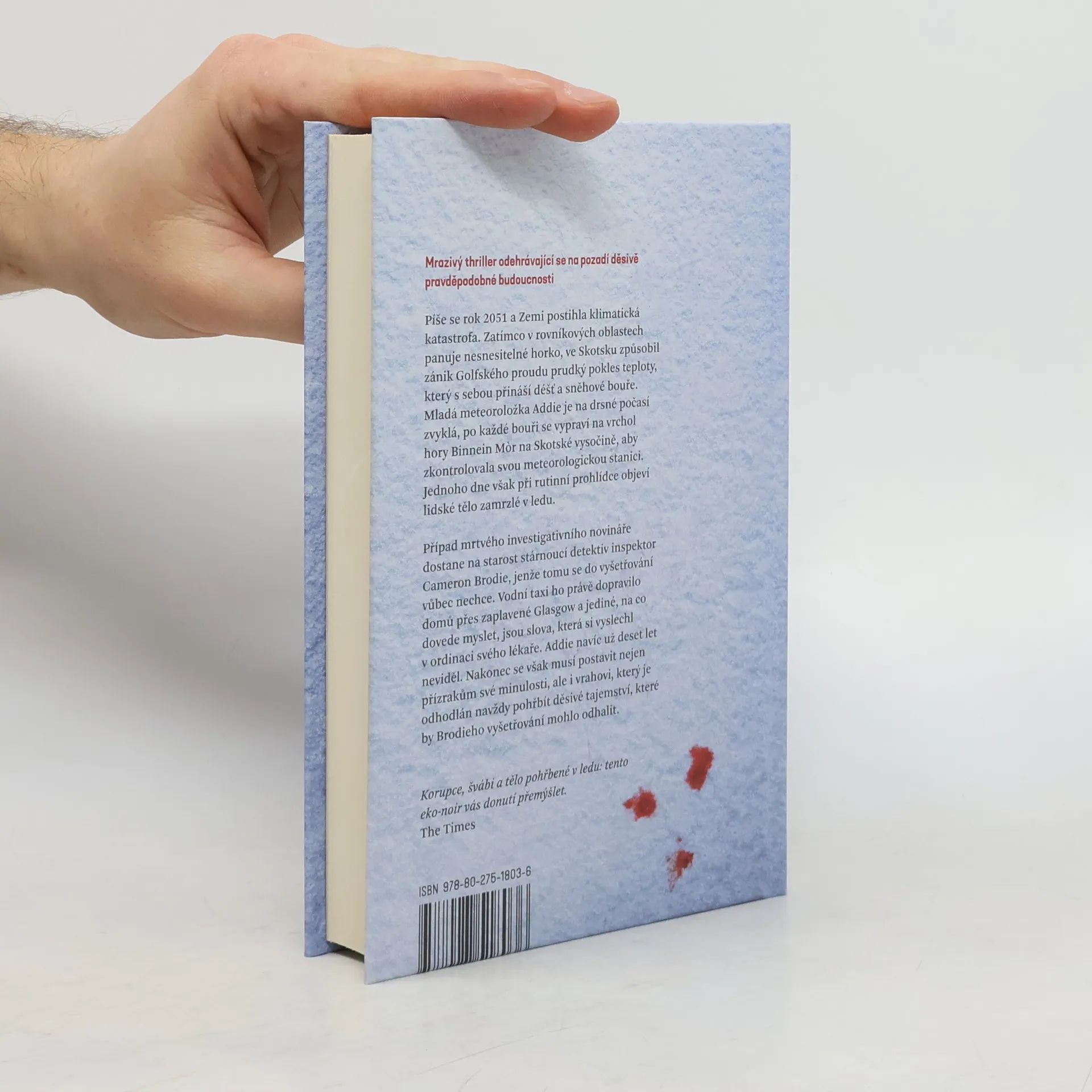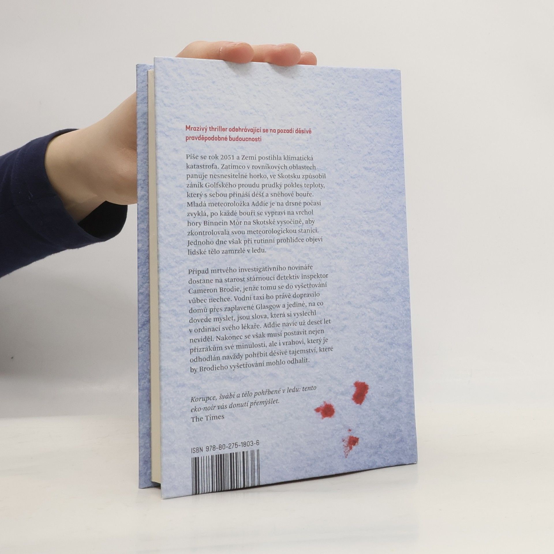 Mrazivý thriller odehrávající se na pozadí děsivě pravděpodobné budoucnosti. Píše se rok 2051 a Zemi postihla klimatická katastrofa. Zatímco v rovníkových oblastech panuje nesnesitelné horko, ve Skotsku způsobil zánik Golfského proudu prudký pokles teploty, který s sebou přináší déšť a sněhové bouře. Mladá meteoroložka Addie se po každé bouři se vypraví na vrchol hory Binnein Mňr na Skotské vysočině, aby zkontrolovala svou meteorologickou stanici. Jednoho dne však při rutinní prohlídce objeví lidské tělo zamrzlé v ledu. Případ mrtvého investigativního novináře dostane na starost stárnoucí detektiv inspektor Cameron Brodie, jenže tomu se do vyšetřování vůbec nechce. Nakonec se však musí postavit nejen přízrakům své minulosti, ale i vrahovi, který je odhodlán navždy pohřbít děsivé tajemství, které by Brodieho vyšetřování mohlo odhalit. Nakladatelská anotace. Kráceno.