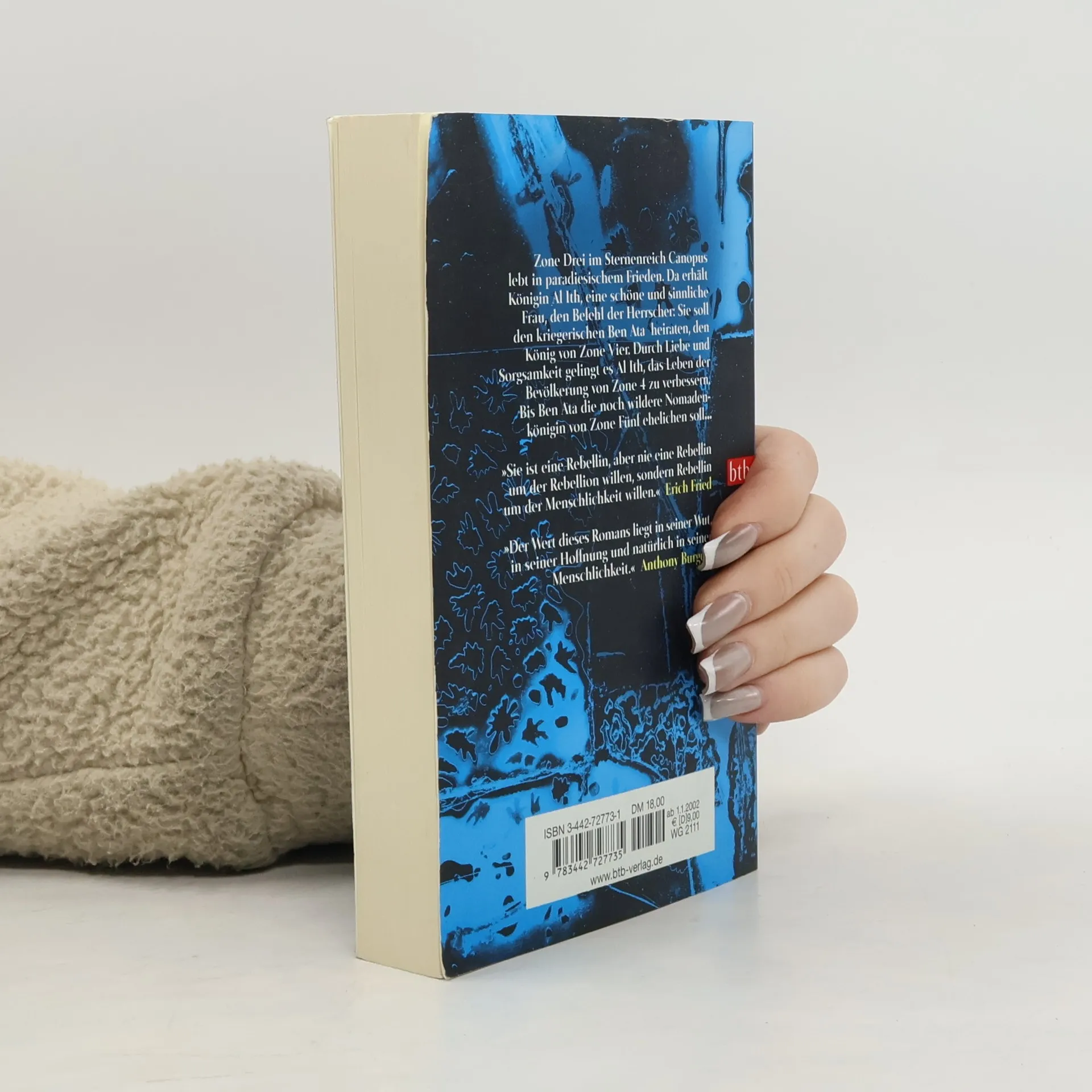 Die Zone Drei eines unbenannten Planeten im Sternenreich „Canopus“ lebt in paradiesischem Frieden. Der Chronist der Zone Drei berichtet von der matriachalischen Ordnung, von Freundlichkeit und Liebe, Sorglosigkeit und materiellem Überfluß. Eines Tages erreicht Königin Al Ith, eine sinnliche, schöne Frau und Mutter mehrerer Kinder, unerwartet der Befehl der Herrscher von Canopus: Sie soll den König von Zone Vier, den kriegerischen Ben Ata heiraten. Die ganze Zone Drei trauert, denn jedem ist bekannt, daß Zone Vier ein dunkler, regnerischer Ort ist, der von unzivilisierten Kriegern bewohnt wird. Trauernd zieht Al Ith zu Ben Ata. Anfangs begegnen sich die beiden voll Mißtrauen, doch im Laufe der Zeit „zivilisiert“ Al Ith ihren Gatten – erst in der Erotik, dann im Gesellschaftlichen. Sehr zum Wohle der Bevölkerung von Zone Vier. Nach der Geburt seines Sohnes erreicht Ben Ata aber erneut ein Befehl der Canopus-Herrscher. Er soll die noch wildere Nomadenkönigin der Zone Fünf heiraten. Al Ith aber blickt sehnsüchtig nach den Bergen der Zone Zwei. „Die Ehe zwischen den Zonen Drei, Vier und Fünf“, der zweite Band der Canopus-Serie ist der leichteste, der verspielteste im ganzen Zyklus: ein Märchen um die Auseinandersetzung zwischen Zivilisation und Barbarei.