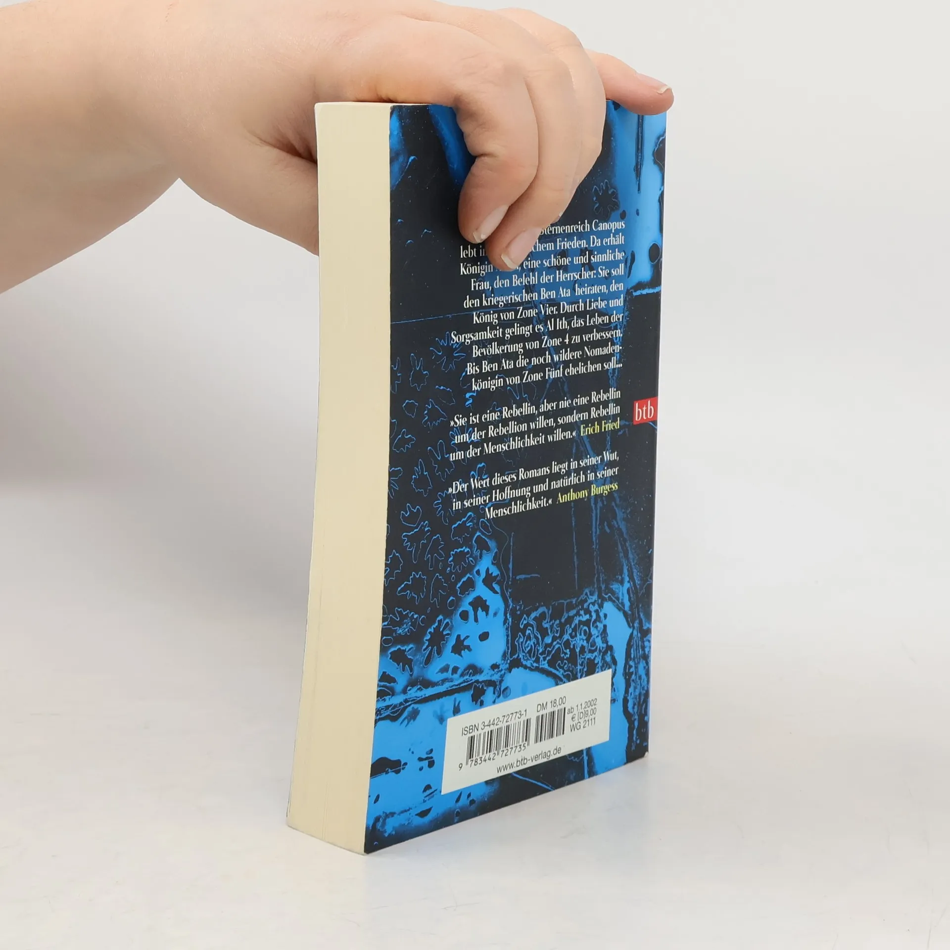 Die Zone Drei eines unbenannten Planeten im Sternenreich „Canopus“ lebt in paradiesischem Frieden. Der Chronist der Zone Drei berichtet von der matriachalischen Ordnung, von Freundlichkeit und Liebe, Sorglosigkeit und materiellem Überfluß. Eines Tages erreicht Königin Al Ith, eine sinnliche, schöne Frau und Mutter mehrerer Kinder, unerwartet der Befehl der Herrscher von Canopus: Sie soll den König von Zone Vier, den kriegerischen Ben Ata heiraten. Die ganze Zone Drei trauert, denn jedem ist bekannt, daß Zone Vier ein dunkler, regnerischer Ort ist, der von unzivilisierten Kriegern bewohnt wird. Trauernd zieht Al Ith zu Ben Ata. Anfangs begegnen sich die beiden voll Mißtrauen, doch im Laufe der Zeit „zivilisiert“ Al Ith ihren Gatten – erst in der Erotik, dann im Gesellschaftlichen. Sehr zum Wohle der Bevölkerung von Zone Vier. Nach der Geburt seines Sohnes erreicht Ben Ata aber erneut ein Befehl der Canopus-Herrscher. Er soll die noch wildere Nomadenkönigin der Zone Fünf heiraten. Al Ith aber blickt sehnsüchtig nach den Bergen der Zone Zwei. „Die Ehe zwischen den Zonen Drei, Vier und Fünf“, der zweite Band der Canopus-Serie ist der leichteste, der verspielteste im ganzen Zyklus: ein Märchen um die Auseinandersetzung zwischen Zivilisation und Barbarei.
