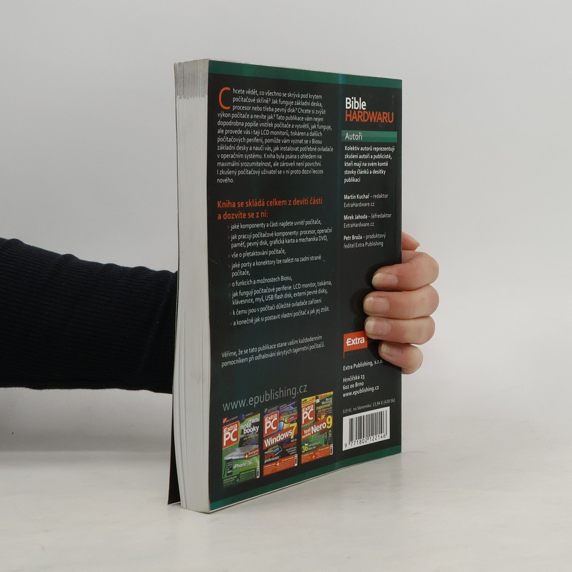 Chcete vědět, co všechno se skrývá pod krytem počítačové skříně? Jak funguje základní deska, procesor nebo třeba pevný disk? Chcete si zvýšit výkon počítače a nevíte jak? Tato publikace vám nejen dopodrobna popíše vnitřek počítače a vysvětlí, jak funguje, ale provede vás i taji LCDmonitorů, tiskáren a dalších počítačových periferií, pomůže vám vyznat se v Biosu základní desky a naučí vás, jak instalovat potřebné ovladače v operačním systému. Kniha byla psána s ohledem na maximální srozumitelnost, ale zároveň není povrchní. Laik, ale i zkušený počítačový uživatel se v ní proto dozví mnoho nového. Kolektiv autorů reprezentují zkušení autoři a publicisté, kteří mají na svém kontě stovky článků a desítky publikací: Martin Kuchař – redaktor ExtraHardware.cz, Mirek Jahoda – šéfredaktor ExtraHardware.cz, Petr Broža.