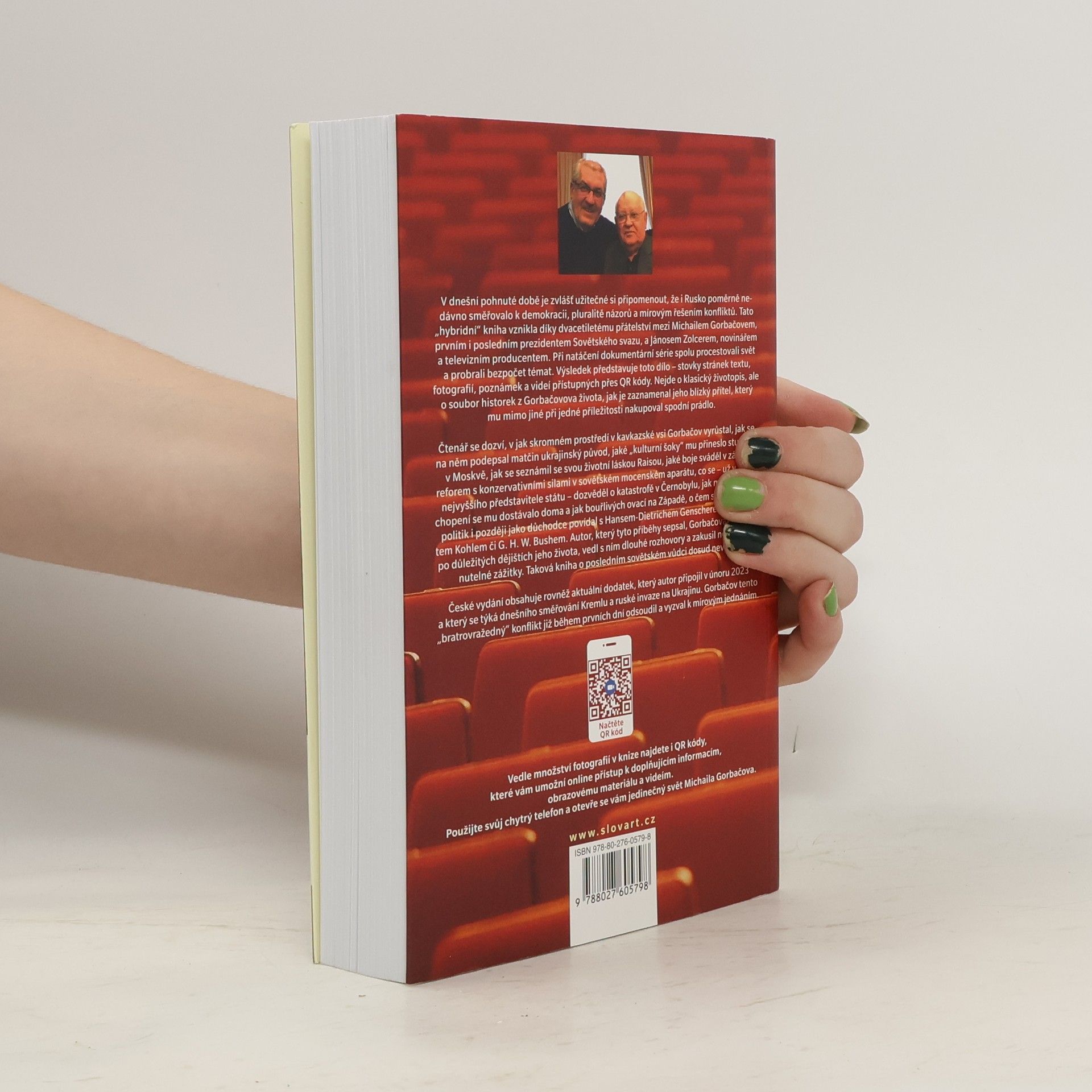 V dnešní pohnuté době je užitečné si připomenout, že Rusko nedávno směřovalo k demokracii a mírovým řešením konfliktů. Tato „hybridní“ kniha vznikla díky dvacetiletému přátelství mezi Michailem Gorbačovem, prvním i posledním prezidentem Sovětského svazu, a Jánosem Zolcerem, novinářem a televizním producentem. Při natáčení dokumentární série spolu procestovali svět a diskutovali o mnoha tématech. Výsledkem je soubor historek z Gorbačovova života, jak je zaznamenal jeho blízký přítel. Čtenář se dozví o skromném prostředí, v němž Gorbačov vyrůstal, o vlivu matčina ukrajinského původu, kulturních šocích ze studia v Moskvě, seznámení s jeho životní láskou Raisou, a o jeho bojích za reformy proti konzervativním silám v sovětském aparátu. Také se dozví, co se naučil o katastrofě v Černobylu, jaký měl ohlas doma a na Západě, a o rozhovorech s významnými politiky jako Hans-Dietrich Genscher či Helmut Kohl. Autor, který Gorbačova provázel důležitými místy jeho života a vedl s ním dlouhé rozhovory, přináší unikátní pohled na posledního sovětského vůdce. Taková kniha dosud nevyšla.