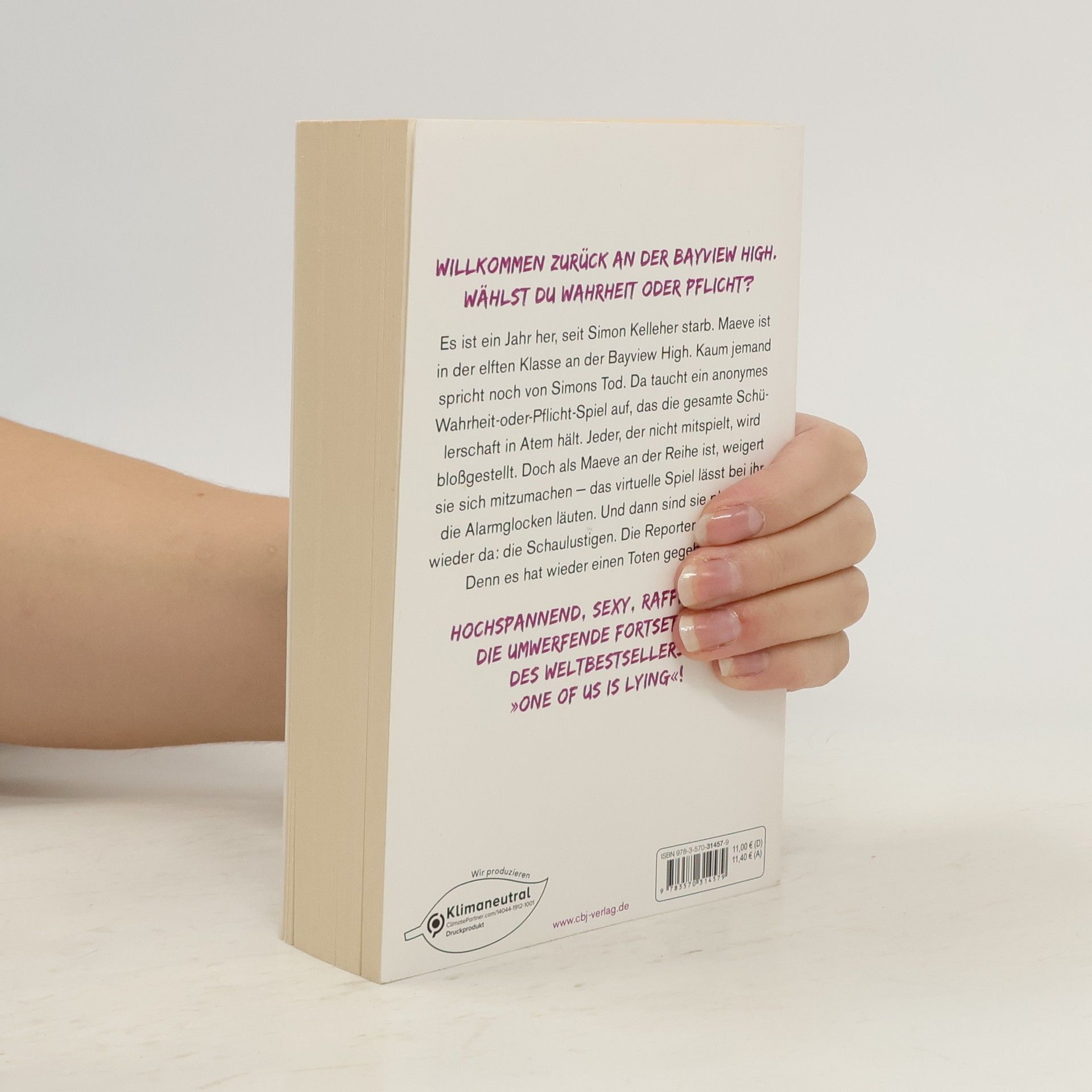 Willkommen zurück an der Bayview High. Gib's zu. Du hast es vermisst. Es ist ein Jahr her, seit Simon Kelleher starb. Maeve ist in der elften Klasse an der Bayview High. Über Simons Tod und dessen Folgen wird kaum mehr geredet. Da taucht ein anonymes Wahrheit-oder-Pflicht-Spiel auf, das die gesamte Schülerschaft in Atem hält. Jeder, der nicht mitspielt, wird bloßgestellt. Doch als Maeve an der Reihe ist, weigert sie sich, mitzumachen — das virtuelle Spiel, ausgerichtet von »DarkestMind«, lässt bei ihr alle Alarmglocken läuten. Und dann sind sie plötzlich wieder da: die Schaulustigen. Die Reporter. Die Polizei. Denn es hat wieder einen Toten gegeben … Die furiose Fortsetzung des Weltbestsellers »One of us is lying« – hochspannend, sexy, raffiniert. Karen M. McManus bei cbj & cbt: One Of Us Is Lying Two Can Keep A Secret One Of Us Is Next The Cousins You will be the death of me Nothing more to tell One of us is back Alle Bücher können unabhängig voneinander gelesen werden.