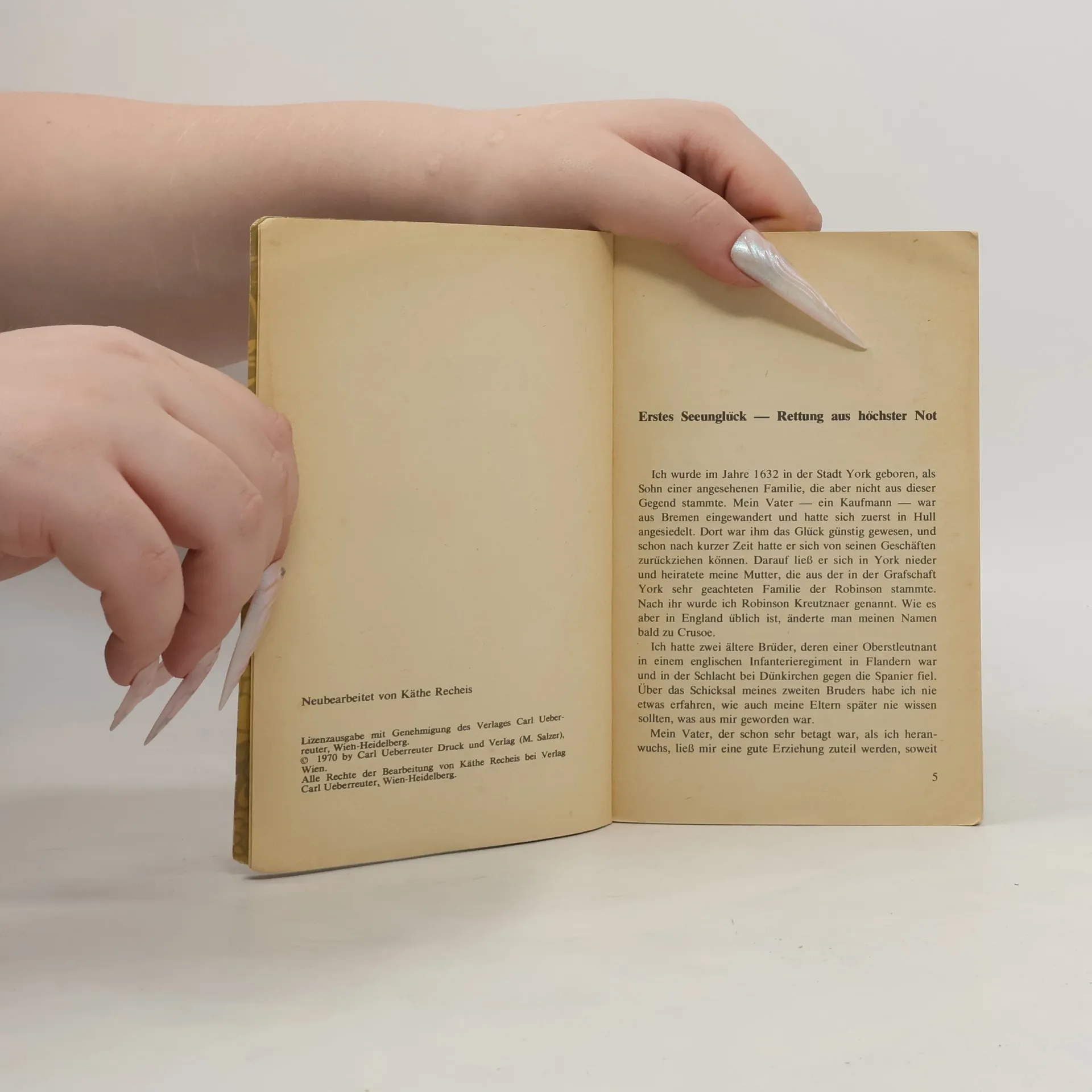 »Das Leben und die seltsamen Abenteuer des Robinson Crusoe, eines Seemanns aus York. Welcher achtundzwanzig Jahre ganz allein auf einer unbewohnten Insel vor der amerikanischen Küste, nahe der Mündung des großen Orinoco lebte, wohin er nach einem Schiffbruch, bei dem die ganze Besatzung außer ihm selbst ums Leben kam, verschlagen wurde. Nebst dem Bericht wie er auf wundersame Weise durch Piraten gerettet wurde. Geschrieben von ihm selbst.« So lautet der volle Titel des Buches, dessen wichtigste Begebenheiten hier in Auswahl dargeboten werden. Gekürzte Ausgabe