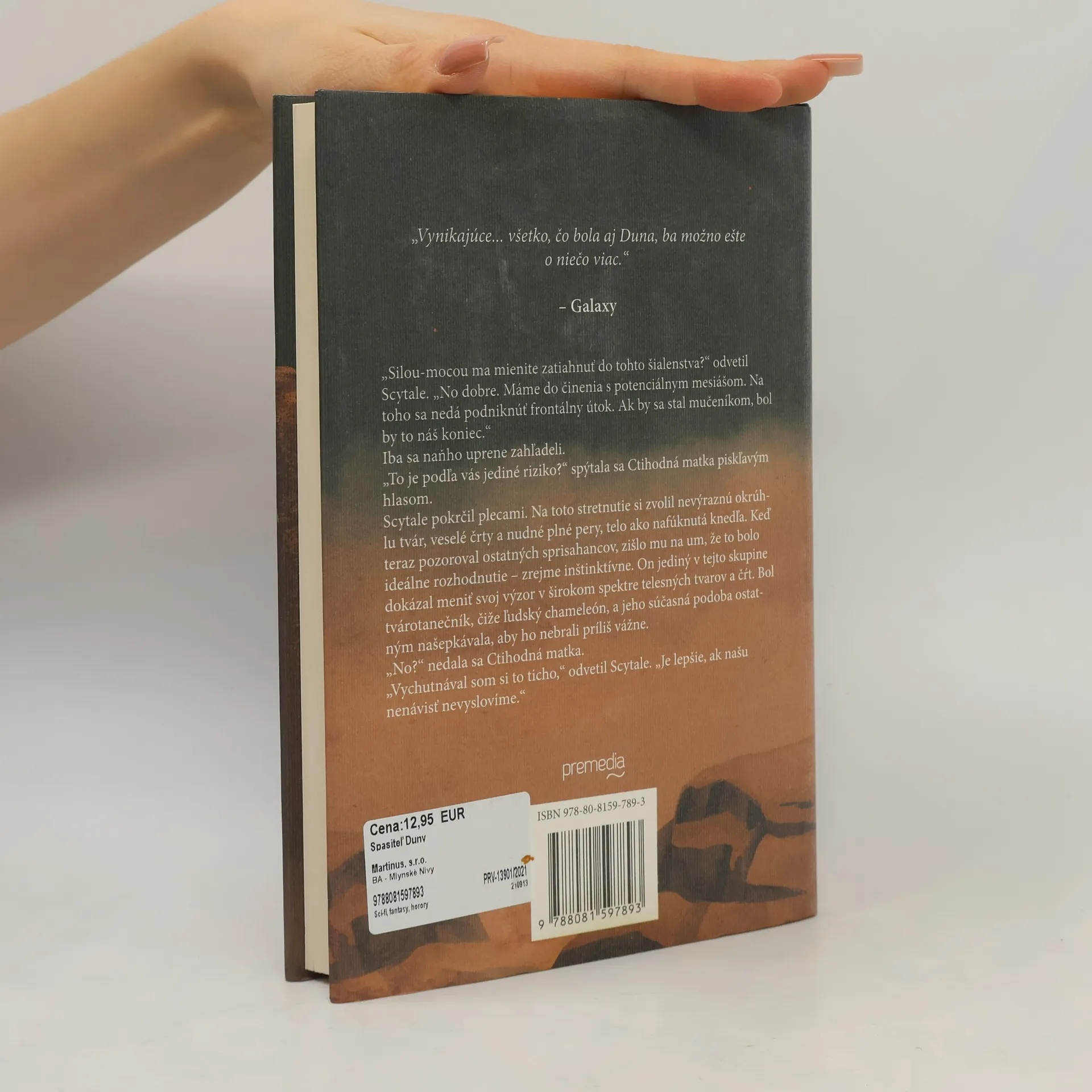 Román o tom, aká je cena víťazstva... a cena vojny. Pokračovanie slávneho románu Duna je viac ako fantasy, viac ako sci-fi: jedinečne výstižná analýza moci a jej dôsledkov pre jednotlivca. Dvanásť rokov po tom, čo pokoril Harkonnenovcov, vládne Paul Atreides ako imperátor celému známemu vesmíru. No jeho víťazstvo má obrovské následky. Rozpútal vojnu, v ktorej zahynuli miliardy ľudí, a hoci sa mu to krviprelievanie protiví, nedokáže ho zastaviť. Dokáže aspoň zachrániť seba a svojich milovaných? Spasiteľ Duny je pokračovanie príbehu Paula Atreidesa, známeho a obávaného pod menom MuadʼDib, ktorý vo svojich rukách sústredil väčšiu moc, než je pre smrteľníka zdravé. Fanatickí Fremeni ho uctievajú ako božstvo, ale veľkorody, ktoré pri svojom nástupe na trón porazil, ho nenávidia. Teraz musí čeliť sprisahaniu z najbližších kruhov. V ohrození je všetko: jeho potomkovia, jeho láska, jeho budúcnosť. A spolu s tým aj budúcnosť celého vesmíru.