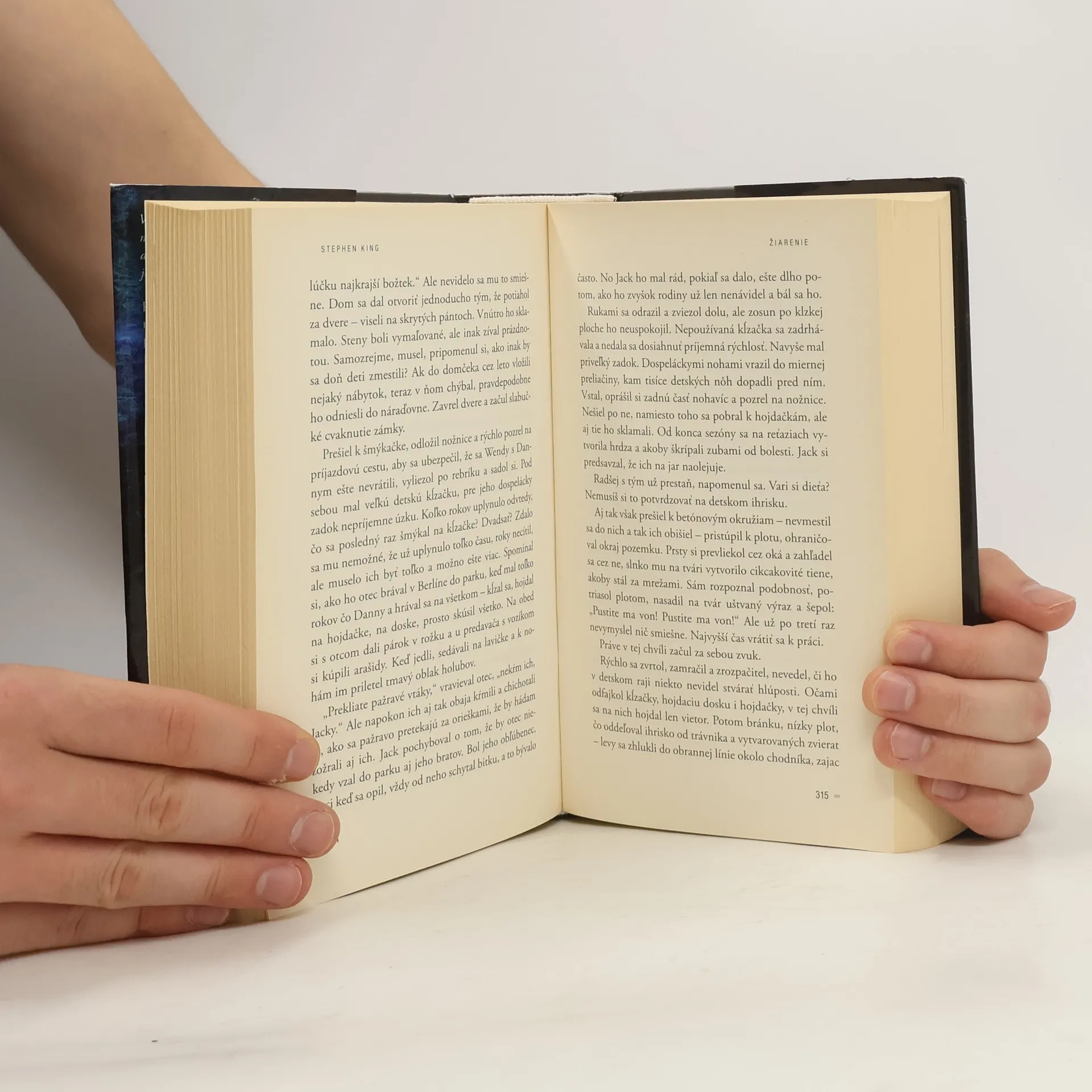 „Vravela, že niečo videla v izbe, kde... sa stalo niečo zlé. V izbe číslo 217. Musíš mi sľúbiť, že do nej nikdy nevojdeš, Danny... vyhýbaj sa jej...“ Hotel Pekná vyhliadka určite patrí medzi najkrajšie horské letoviská na svete, ale nielen preto tu Jack Torrance, dramatik a bývalý alkoholik, prijal miesto správcu v mimosezónnom období. Považuje to najmä za príležitosť na nový začiatok a dúfa, že tu počas zimy napíše svoj nový román. Zúfalo totiž potrebuje uniknúť životnej smole a beznádeji, ktoré ho vytrvalo prenasledujú. Spolu s ním sem prichádza jeho manželka Wendy, aby v majestátnej samote starého hotela so zvláštnou atmosférou, postavenom na starom indiánskom pohrebisku, hľadala možnosť záchrany narušeného manželstva a rodiny. A napokon je tu Danny, päťročný syn s neobyčajným darom – je mimoriadne vnímavý, „žiari“, a má schopnosť predvídať udalosti, ktorým však vo svojom veku nerozumie. V stodesiatich prázdnych hotelových izbách sa totiž niečo deje, niečo, z čoho prechádza mráz po chrbte, skryté zlo, ktoré v hoteli odrezanom od sveta striehne a hrozí...