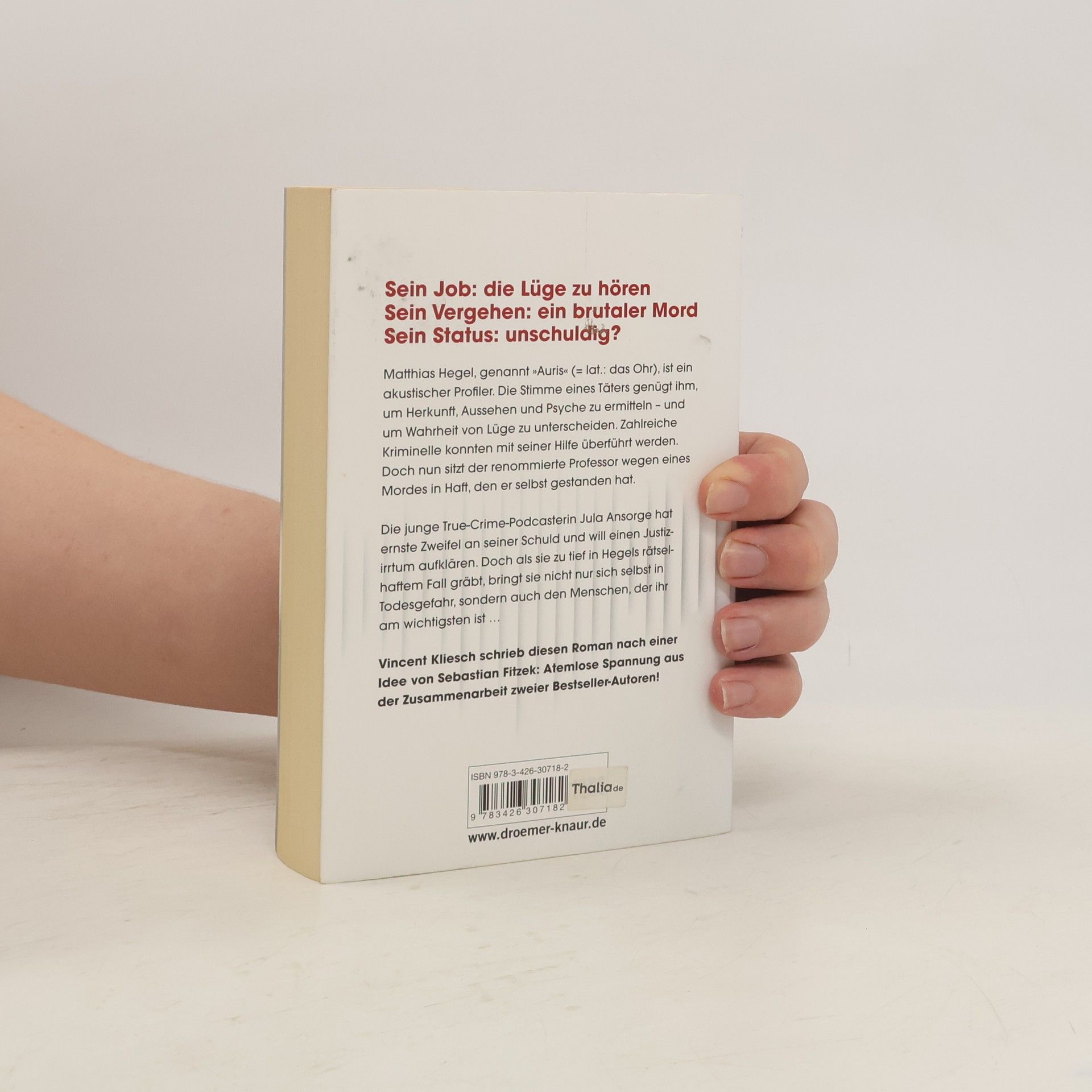 Sie ist jung. Sie glaubt an die Wahrheit. Ein tödlicher Fehler? Rasant und ungewöhnlich: Thriller-Spannung aus der Zusammenarbeit zweier Bestseller-Autoren! Vincent Kliesch schrieb diesen Roman nach einer Idee von Sebastian Fitzek. Die kleinste Abweichung im Klang einer Stimme genügt dem berühmten forensischen Phonetiker Matthias Hegel, um Wahrheit von Lüge zu unterscheiden. Zahlreiche Kriminelle konnten mit seiner Hilfe bereits überführt werden. Hat der Berliner Forensiker nun selbst gelogen? Allzu freimütig scheint sein Geständnis, eine Obdachlose in einem heftigen Streit ermordet zu haben. Die True-Crime-Podcasterin Jula Ansorge, darauf spezialisiert, unschuldig Verurteilte zu rehabilitieren, will unbedingt die Wahrheit herausfinden. Doch als sie zu tief in Hegels Fall gräbt, bringt sie nicht nur sich selbst in größte Gefahr … Der Start einer neuen Thriller-Reihe von Vincent Kliesch und Sebastian Fitzek - rund um die junge True-Crime-Podcasterin Jula Ansorge und das faszinierende Thema forensische Phonetik.