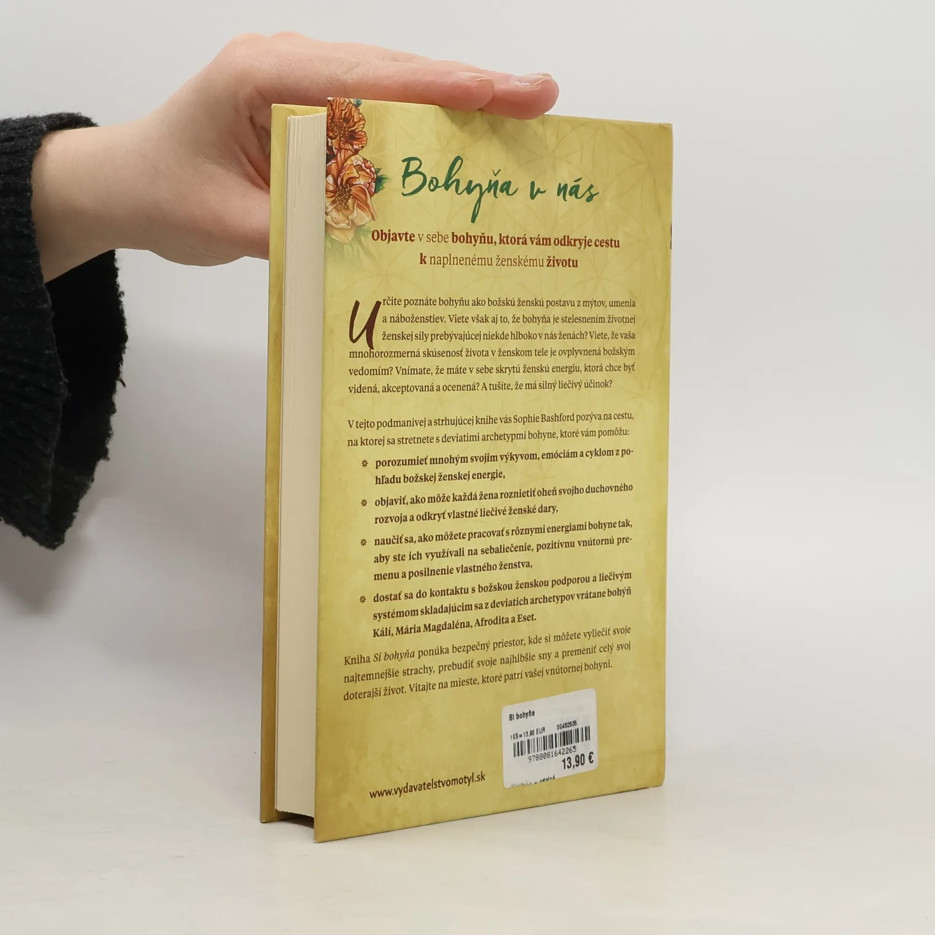 Bohyňa v nás Objavte v sebe bohyňu, ktorá vám odkryje cestu k naplnenému ženskému životu. Určite poznáte bohyňu ako božskú ženskú postavu z mýtov, umenia a náboženstiev. Viete však aj to, že bohyňa je stelesnením životnej ženskej sily prebývajúcej niekde hlboko v nás ženách? Viete, že vaša mnohorozmerná skúsenosť života v ženskom tele je ovplyvnená božským vedomím? Vnímate, že máte v sebe skrytú ženskú energiu, ktorá chce byť videná, akceptovaná a ocenená? A tušíte, že má silný liečivý účinok? V tejto podmanivej a strhujúcej knihe vás Sophie Bashford pozýva na cestu, na ktorej sa stretnete s deviatimi archetypmi bohyne, ktoré vám pomôžu.