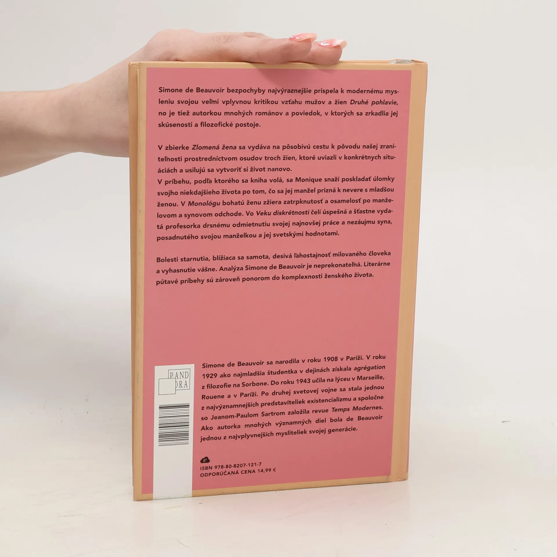 Simone de Beauvoir bezpochyby najvýraznejšie prispela k modernému mysleniu svojou veľmi vplyvnou kritikou vzťahu mužov a žien Druhé pohlavie, no je tiež autorkou mnohých románov a poviedok, v ktorých sa zrkadlia jej skúsenosti a filozofické postoje. V zbierke Zlomená žena sa vydáva na pôsobivú cestu k pôvodu našej zraniteľnosti prostredníctvom osudov troch žien, ktoré uviazli v konkrétnych situáciách a usilujú sa vytvoriť si život nanovo. V príbehu, podľa ktorého sa kniha volá, sa Monique snaží poskladať úlomky svojho niekdajšieho života po tom, čo sa jej manžel prizná k nevere s mladšou ženou. V Monológu bohatú ženu zžiera zatrpknutosť a osamelosť po manželovom a synovom odchode. Vo Veku diskrétnosti čelí úspešná a šťastne vydatá profesorka drsnému odmietnutiu svojej najnovšej práce a nezáujmu syna, posadnutého svojou manželkou a jej svetskými hodnotami. Bolesti starnutia, blížiaca sa samota, desivá ľahostajnosť milovaného človeka a vyhasnutie vášne. Analýza Simone de Beauvoir je neprekonateľná. Literárne pútavé príbehy sú zároveň ponorom do komplexnosti ženského života.