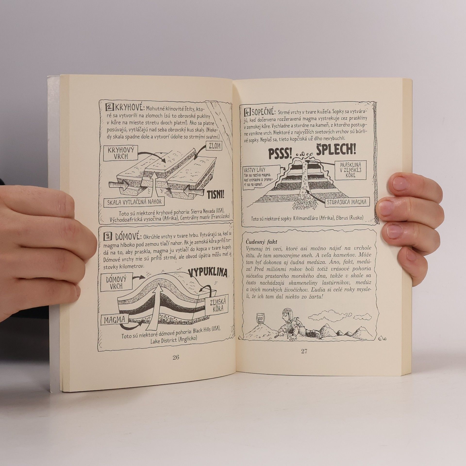 Štvú vás neprehľadné mapy, rozpadnuté kopy kameňov a jazykolomné pojmy? Dajte zbohom nudným hodinám zemepisu a vylezte do omamných výšok Šibnutých štítov. Uvidíte medúzy zaseknuté na vrchole štítu, narazíte na legendárneho yetiho, pobežíte ako o život, keď sa na vás bude rútiť lavína. Vydajte sa na vzrušujúcu túru od Everestu po Kilimandžáro, prečítajte si o odvážnych objaviteľoch, ktorí si spievali piesne, aby prežili, a sledujte, ako mohutný ľadovec vyrezáva obrovskú ryhu horským úbočím. Bude to hrozne vzrušujúce.