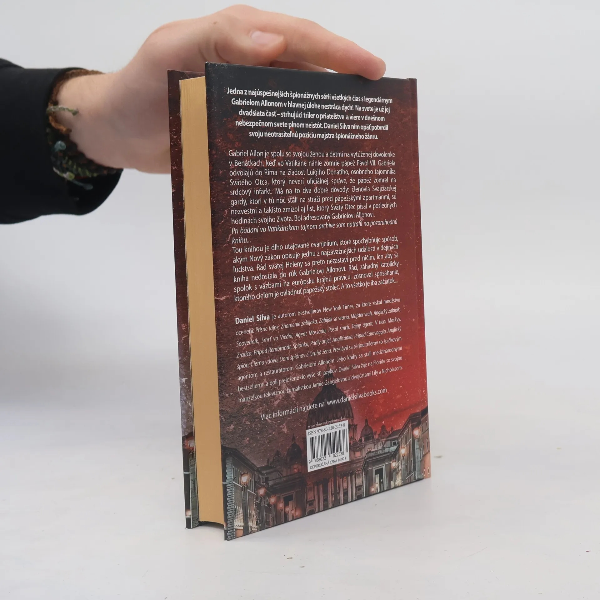 Jedna z najúspešnejších špionážnych sérií všetkých čias s legendárnym Gabrielom Allonom v hlavnej úlohe nestráca dych! Na svete je už jej dvadsiata časť – strhujúci triler o priateľstve a viere v dnešnom nebezpečnom svete plnom neistôt. Daniel Silva ním opäť potvrdil svoju neotrasiteľnú pozíciu majstra špionážneho žánru. Gabriel Allon je spolu so svojou ženou a deťmi na vytúženej dovolenke v Benátkach, keď vo Vatikáne náhle zomrie pápež Pavol VII. Gabriela odvolajú do Ríma na žiadosť Luigiho Donatiho, osobného tajomníka Svätého Otca, ktorý neverí oficiálnej správe, že pápež zomrel na srdcový infarkt. Má na to dva dobré dôvody: členovia Švajčiarskej gardy, ktorí v tú noc stáli na stráži pred pápežskými apartmánmi, sú nezvestní a takisto zmizol aj list, ktorý Svätý Otec písal v posledných hodinách svojho života. Bol adresovaný Gabrielovi Allonovi. Pri bádaní vo Vatikánskom tajnom archíve som natrafil na pozoruhodnú knihu... Tou knihou je dlho utajované evanjelium, ktoré spochybňuje spôsob, akým Nový zákon opisuje jednu z najzávažnejších udalostí v dejinách ľudstva. Rád svätej Heleny sa preto nezastaví pred ničím, len aby sa kniha nedostane do rúk Gabrielovi Allonovi. Rád, záhadný katolícky spolok s väzbami na európsku krajnú pravicu, zosnoval sprisahanie, ktorého cieľom je ovládnuť pápežský stolec. A to všetko je iba začiatok...