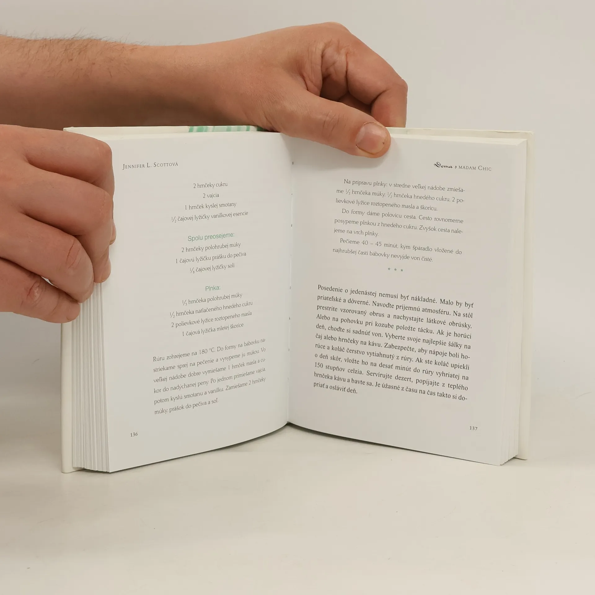 Jennifer Scottová ako študentka na zahraničnom výmennom pobyte v Paríži bývala u rodiny, ktorá ju inšpirovala a zásadne ovplyvnila jej životný štýl. Pani domu madam Chic si vzala bezstarostnú dospievajúcu dievčinu z Kalifornie pod svoje ochranné krídla a umožnila jej spoznať, ako Francúzi povyšujú bežné maličkosti života na umenie žiť. Po rokoch zoči-voči všedným povinnostiam Jeniffer spomínala na domov madam Chic – raňajkový stôl nádherne prestretý už predchádzajúci večer, hudba znejúca v pozadí, pokojná atmosféra koktailovej hodinky s madam a monsieur Chic. Zatúžila po takomto živote. Rozhodla sa zistiť, čo by sa stalo, keby sa namiesto netrpezlivého a chaotického vykonávania domácich prác pokúsila žiť ako madam Chic. Kniha Doma s madam Chic prináša návod, ako viesť doma šťastný, moderný a zmysluplný život bez ohľadu na náročnosť vášho denného programu či rozpočet. Jennifer vám poradí, ako zaviesť rutinu, ktorá vám pomôže žiť bez neporiadku, ako vyvolať dobrú náladu, vybudovať si funkčný šik šatník, v ktorom je len desať kúskov oblečenia, pomôže vám premeniť svoje pracovisko na pokojnú oázu a byť kedykoľvek pripravená aj na nečakanú návštevu. Stačí, ak sa budete riadiť jej jednoduchými radami – priamo z Paríža a od madam Chic!