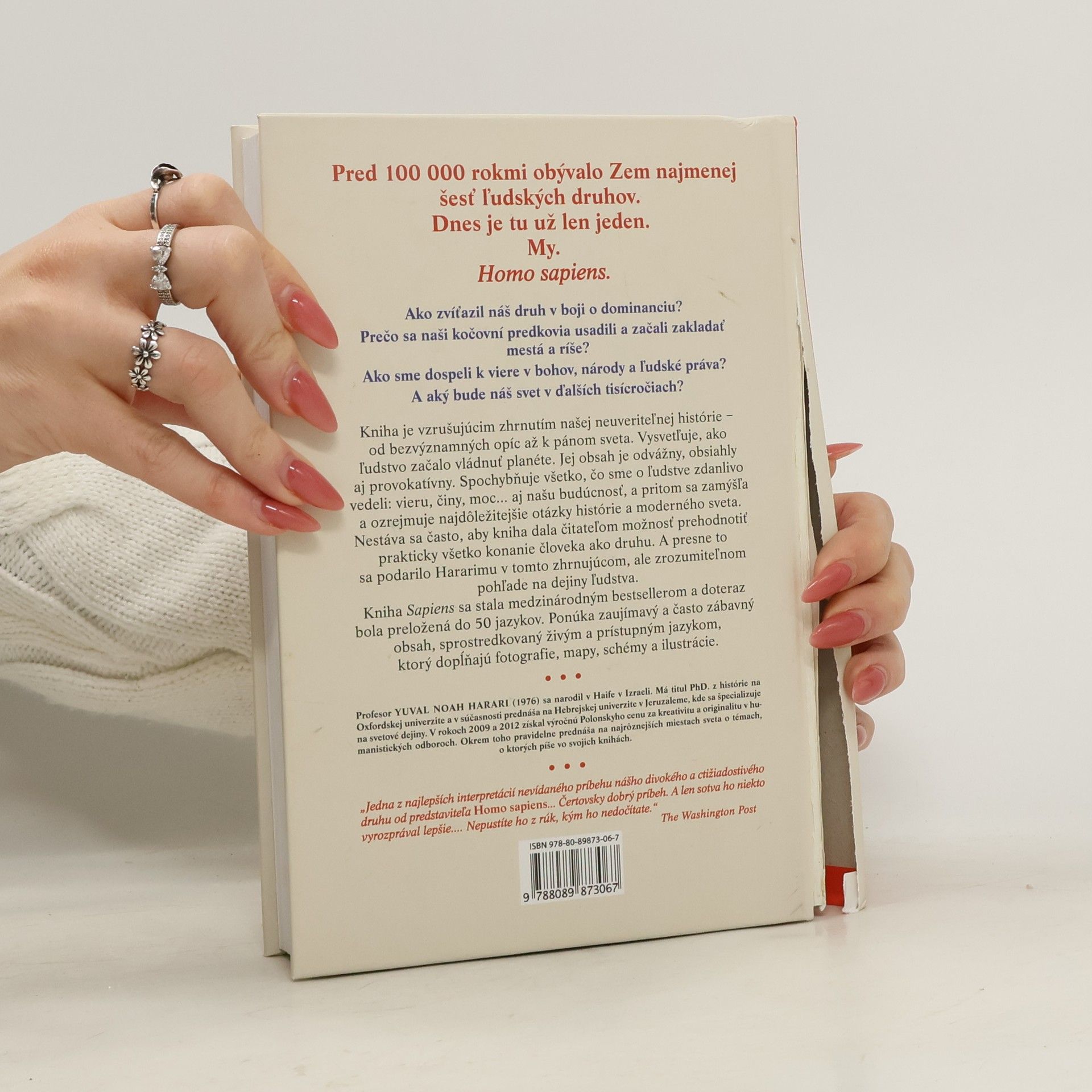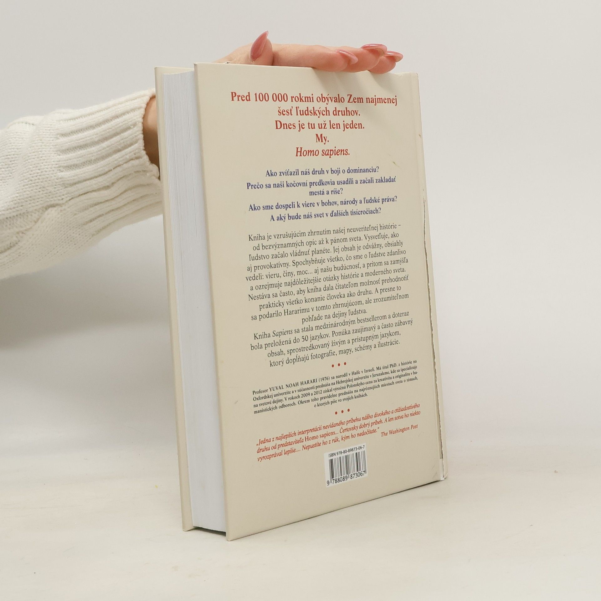 Pred 100 000 rokmi žilo na Zemi najmenej šesť ľudských druhov, dnes je tu len Homo sapiens. Autor, Dr. Yuval Noah Harari, známy vizionársky historik, skúma históriu človeka od jeho počiatkov až po súčasnosť, pričom sa zameriava na tri kľúčové revolúcie: kognitívnu, poľnohospodársku a vedeckú. Kniha sa pýta, ako sme sa stali dominantným druhom, prečo sa naši predkovia usadili a začali budovať mestá a ríše, a aký vplyv má na nás viera v bohov, národy či ľudské práva. Harari čerpá z rôznych disciplín, ako sú história, biológia a ekonómia, aby preskúmal, ako formovali naše spoločnosti a vzťahy s prírodou. Klade otázky o našej šťastnej existencii, o tom, či môžeme oslobodiť naše správanie od dedičstva predkov, a čo môžeme urobiť pre ovplyvnenie budúcnosti. Kniha provokuje zamyslenie nad našou históriou a budúcnosťou, pričom skúma vplyv ľudského správania a vedeckého pokroku na zákony prírody. Tento vzrušujúci prehľad našej histórie, od bezvýznamných opíc po pánov sveta, spochybňuje naše presvedčenia a činy. Harari ponúka čitateľom možnosť prehodnotiť všetko, čo sme o ľudstve vedeli. Kniha sa stala medzinárodným bestsellerom, je písaná živým jazykom a doplnená o fotografie, mapy a ilustrácie, čo zvyšuje jej atraktivitu.