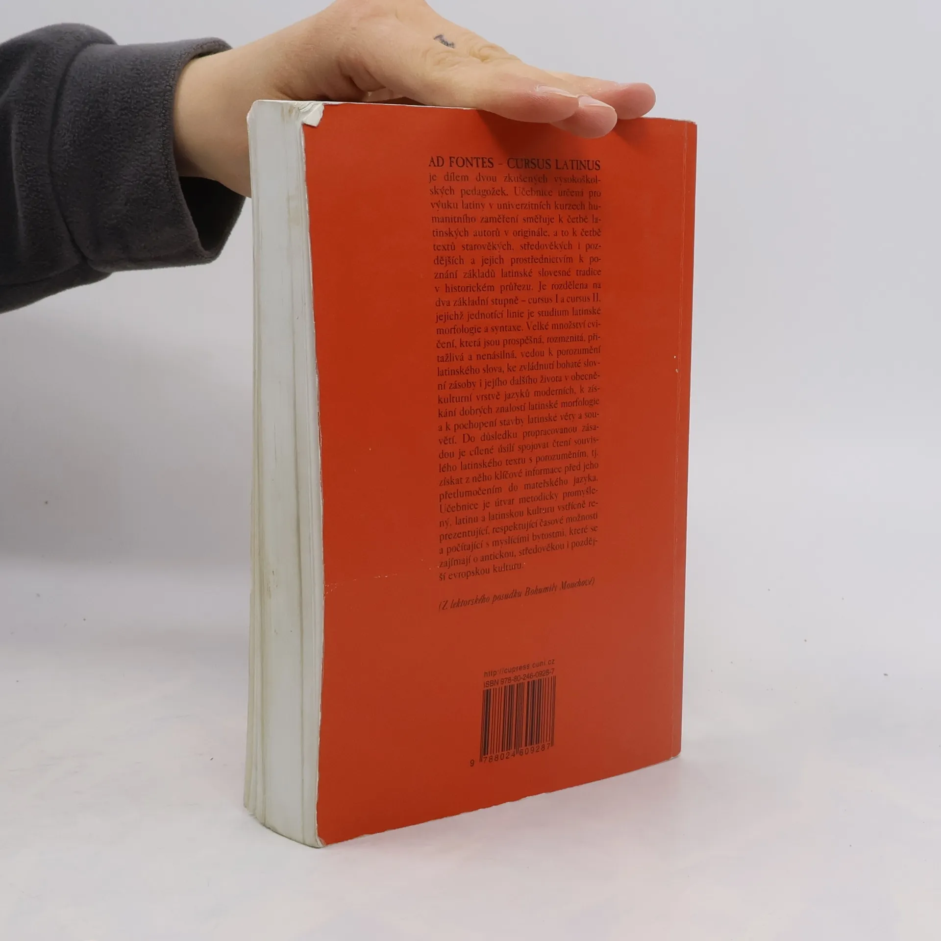 AD FONTES CURSUS LATINUS je dílem dvou zkušených vysokoškolských pedagožek. Učebnice určená pro výuku latiny v univerzitních kurzech humanitního zaměření zve k četbě textů latinských autorů v originále, a to starověkých, středověkých i pozdějších. Jejich prostřednictvím vede k poznání základů latinské slovesné tradice v historickém průřezu. Publikace je rozdělena na dva základní stupně – cursus I a cursus II –, jejichž jednotící linie je studium latinské morfologie a syntaxe. Velké množství rozmanitých, nenásilných cvičení vede k porozumění latinskému slovu, ke zvládnutí bohaté slovní zásoby i k vnímání jejího dalšího života v obecně-kulturní vrstvě jazyků moderních. Umožňuje také získání dobrých znalostí latinské morfologie a pochopení stavby latinské věty a souvětí. Do důsledku dodržovanou zásadou je úsilí spojovat čtení souvislého latinského textu s porozuměním, tj. získat z něho klíčové informace před jeho přetlumočením do mateřského jazyka