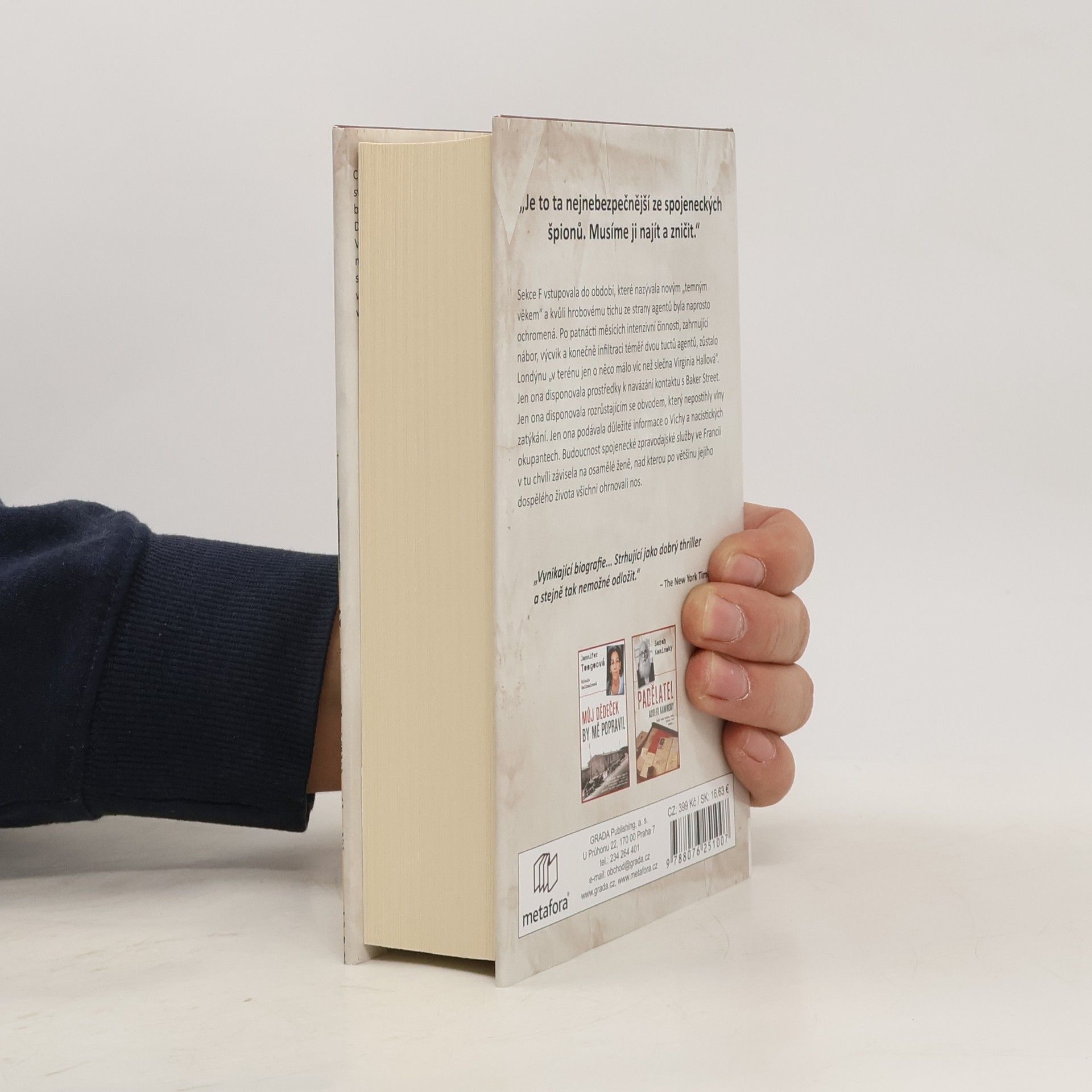 Dosud nezveřejněný příběh špionky, ze které mělo strach i samotné gestapo, přináší fascinující pohled na život Virginie Hallové. Pocházela z majetné rodiny z Baltimoru, kde studovala jazyky a ekonomii. Pracovala na americké ambasádě ve Varšavě a snila o kariéře na Ministerstvu zahraničí, ale po nehodě při lovu v roce 1932 přišla o nohu, což její ambice zkomplikovalo. Přesto se dokázala prosadit ve službách britské rozvědky, stala se první ženou nasazenou za nepřátelskou linií, kde vybudovala rozsáhlé špionážní sítě ve Francii. Byla klíčovou osobou odboje, organizovala shozy zbraní a výbušnin a stala se průkopnicí tajného bojiště. Gestapo po ní neúnavně pátralo, plakáty s její podobiznou visely téměř všude a byla na ni vypsaná odměna, ale ona odmítala z Francie odejít. Až po odhalení uprchla přes Pyreneje do Španělska, ale brzy se vrátila, aby vedla úspěšnou partyzánskou válku proti nacistům během invaze v Normandii. Sonia Purnellová na základě nových informací a rozsáhlého výzkumu odhaluje tajný život Virginie Hallové v inspirativním příběhu o hrdinství a osobním vítězství nad nepřízní osudu, ukazujícím, jak vytrvalost jedné ženy pomohla vyhrát nejdůležitější válku v historii.
