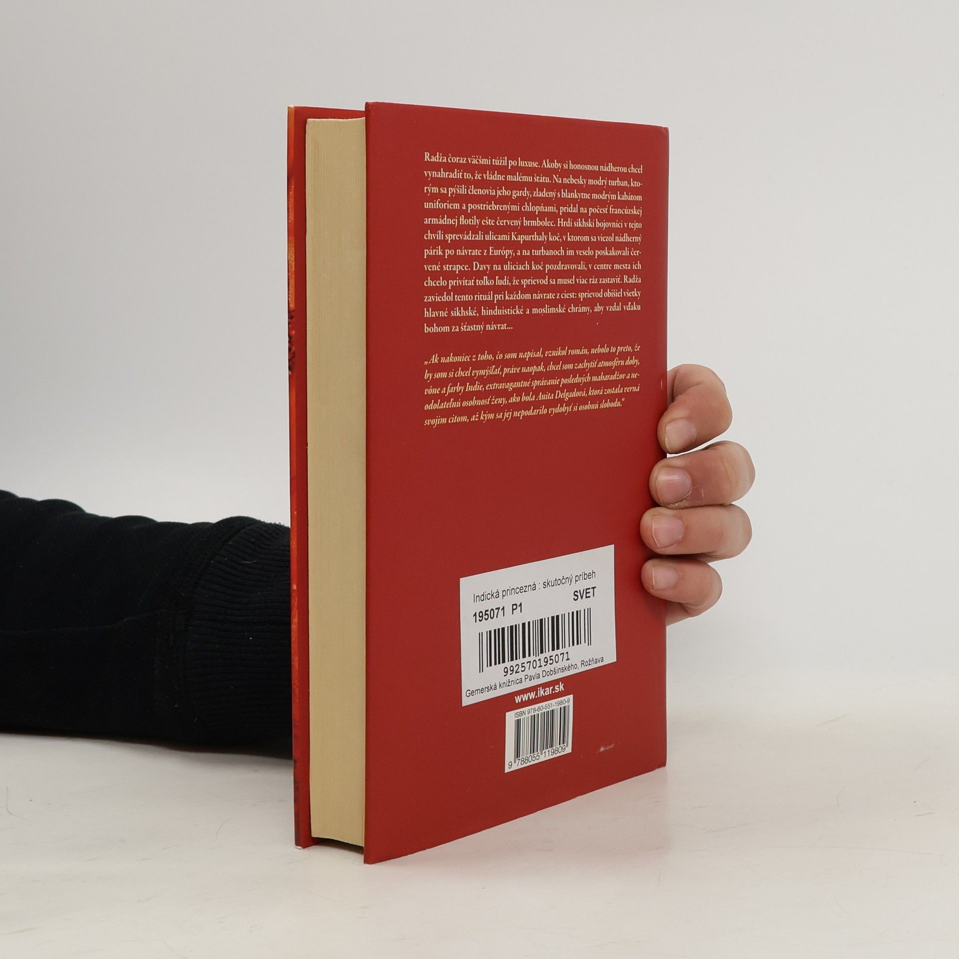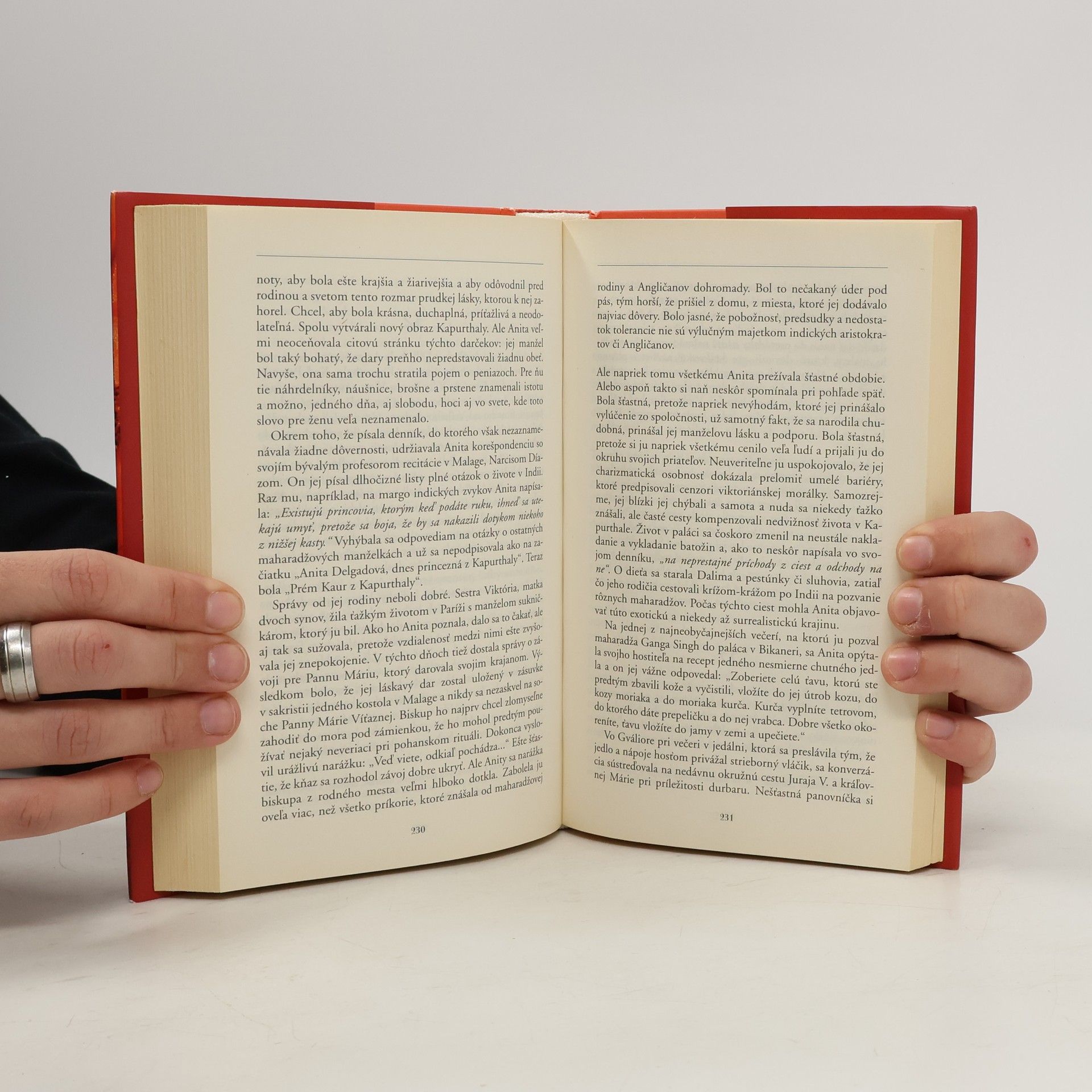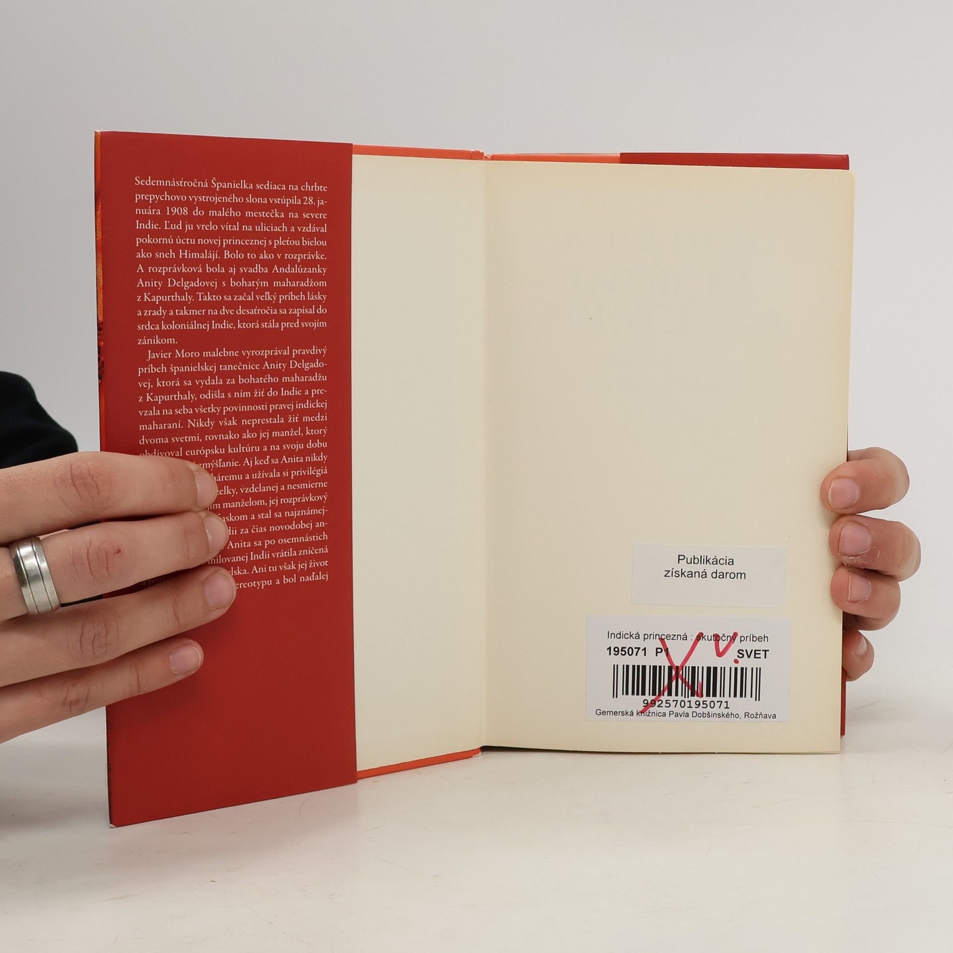 Ak nakoniec z toho, čo som napísal, vznikol román, nebolo to preto, že by som si chcel vymýšľať, práve naopak, chcel som zachytiť atmosféru doby, vône a farby Indie, extravagantné správanie posledných maharadžov a neodolateľnú osobnosť ženy, ako bola Anita Delgadová, ktorá zostala verná svojim citom, až kým sa jej nepodarilo vydobyť si osobnú slobodu. Javier Moro. Príbeh Anity Delgadovej, španielskej tanečnice, ktorá sa vydala za indického maharadžu a stala sa tak takmer za noc indickou princeznou, je vyrozprávaný na základe skutočných udalostí. Spolu s Anitou sa čitateľ prenesie do Indie obdobia výstredných maharadžov a vstúpi do sveta rozprávkovej nádhery, do sveta, ktorý dnes už neexistuje. Príbeh Anity a maharadžu z Kapurthaly nie je iba romantickým rozprávaním o tom, čo prináša so sebou láska, ale aj príbehom, ktorý ukazuje na odlišnosť kultúr, na osobitný vzťah Indie a Európy, na úskalia, ktoré odlišnosť oboch kultúr človeku prinášajú. V neposlednom rade je to pôsobivé rozprávanie o konci jednej epochy indických dejín, v ktorom sa stretávame s konkrétnymi ľuďmi, s ich problémami, túžbami i vášňami, ktoré často vedú k činom, ktorými človek následne opovrhuje a ktoré človeka deštruujú. K zrade, klamstvám a podvodom... Rozprávkový príbeh Anity sa napokon skončil fiaskom a stal sa najznámejším škandálom v Indii z čias novodobej anglickej kolonizácie.