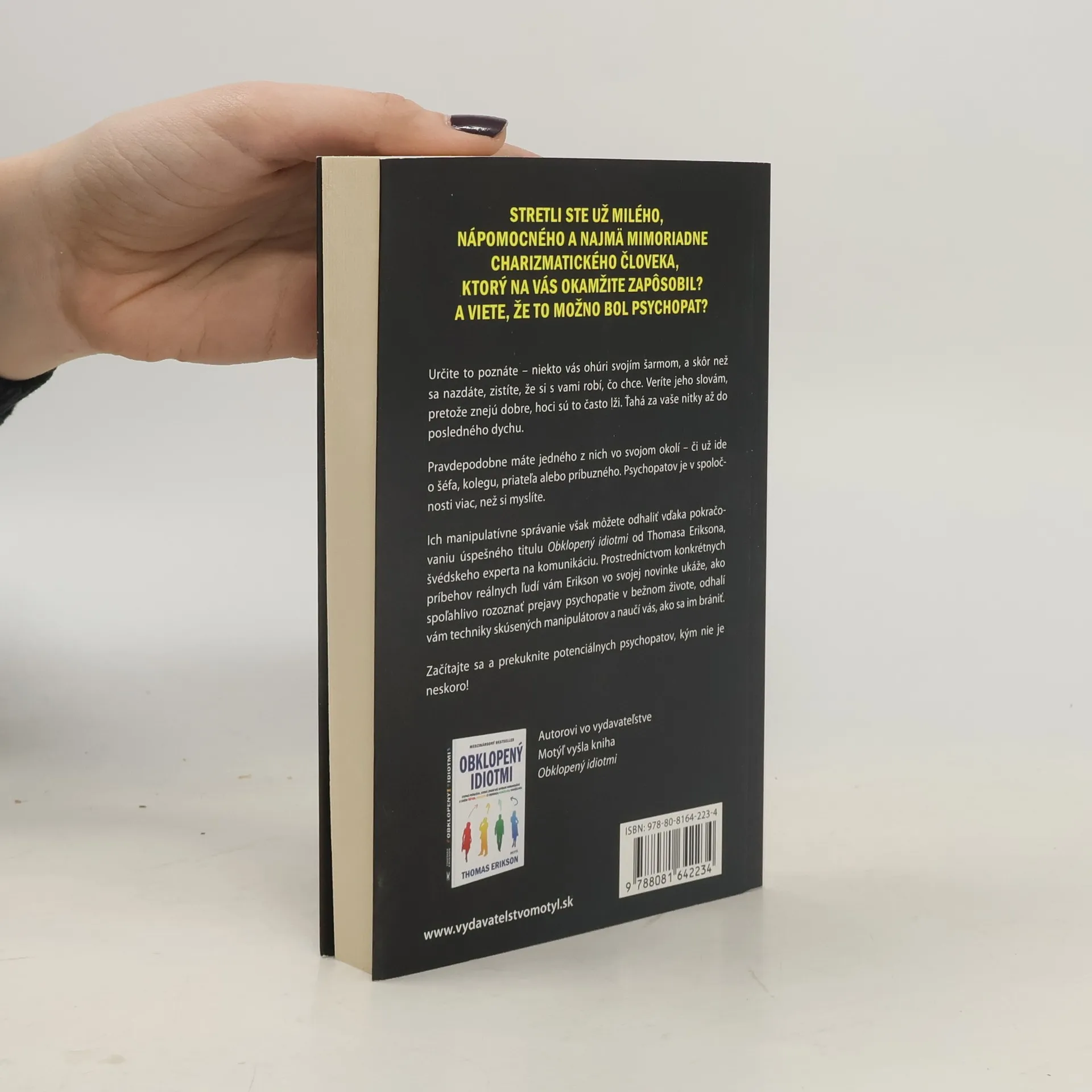 Stretli ste už milého, nápomocného a najmä mimoriadne charizmatického človeka, ktorý na vás okamžite zapôsobil? A viete, že to možno bol psychopat? Určite to poznáte - niekto vás ohúri svojím šarmom, a skôr než sa nazdáte, zistíte, že si s vami robí, čo chce. Veríte jeho slovám, pretože znejú dobre, hoci sú to často lži. Ťahá za vaše nitky až do posledného dychu. Pravdepodobne máte jedného z nich vo svojom okolí - či už ide o šéfa, kolegu, priateľa alebo príbuzného. Psychopatov je v spoločnosti viac, než si myslíte. Ich manipulatívne správanie však môžete odhaliť vďaka pokračovaniu úspešného titulu Obklopený idiotmi od Thomasa Eriksona, švédskeho experta na komunikáciu. Prostredníctvom konkrétnych príbehov reálnych ľudí vám Erikson vo svojej novinke ukáže, ako spoľahlivo rozoznať prejavy psychopatie v bežnom živote, odhalí vám techniky skúsených manipulátorov a naučí vás, ako sa im brániť. Začítajte sa a prekuknite potenciálnych psychopatov, kým nie je neskoro!