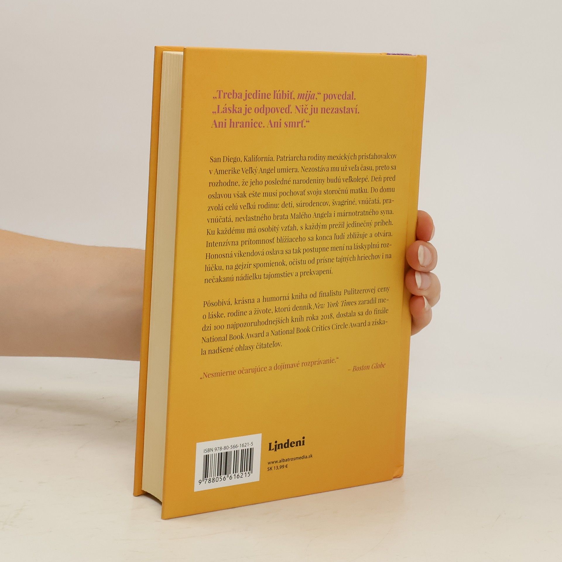 „Treba jedine ľúbiť, mija,“ povedal. „Láska je odpoveď. Nič ju nezastaví. Ani hranice. Ani smrť.“ San Diego. Patriarcha rodiny mexických prisťahovalcov v Amerike Veľký Angel umiera. Nezostáva mu už veľa času, preto sa rozhodne, že jeho posledné narodeniny budú veľkolepé. Deň pred oslavou však ešte musí pochovať svoju storočnú matku. Do domu zvolá celú veľkú rodinu: deti, súrodencov, švagriné, vnúčatá, pravnúčatá, nevlastného brata Malého Angela i márnotratného syna. Ku každému má osobitý vzťah, s každým prežil jedinečný príbeh. Intenzívna prítomnosť blížiaceho sa konca ľudí zbližuje a otvára. Honosná víkendová oslava života sa tak postupne mení na láskyplnú rozlúčku, na gejzír spomienok, očistu od prísne tajných hriechov i na nečakanú nádielku tajomstiev a prekvapení. Pôsobivá, krásna a humorná kniha od finalistu Pulitzerovej ceny o láske, rodine, začiatkoch a koncoch, ktorú denník New York Times zaradil medzi 100 najpozoruhodnejších kníh roka 2018, dostala sa do finále National Book Award a National Book Critics Circle Award a získala nadšené ohlasy kritikov.