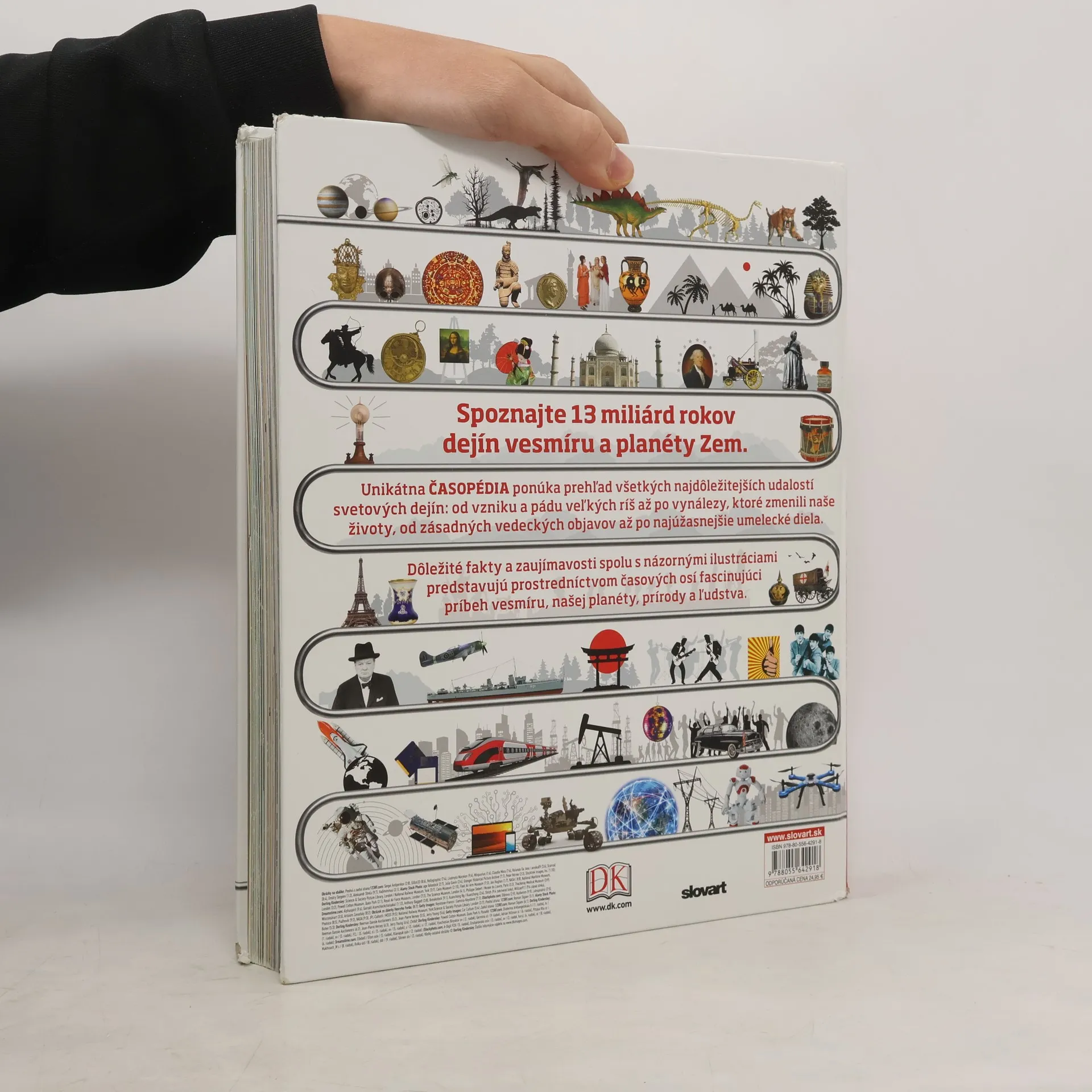 Od dinosaurov po umelú inteligenciu Preskúmajte históriu sveta prostredníctvom časových osí - od dejín vesmíru, cez vznik života na Zemi, éru dinosaurov a objavenie sa predkov ľudí, až po vesmírne lety a nástup robotiky. Kniha je doslova nabitá faktami a úžasnými detailmi. Dozviete sa, ako sa vyvíjalo písmo, kto boli autori najdôležitejších objavov, ako vznikali a zanikali rôzne ríše, ale aj kto bol najobávanejším pirátom všetkých čias a ktorý zločin sa ako prvý podarilo vyriešiť vďaka analýze odtlačkov prstov. Prehľadné diagramy s úžasnými ilustráciami a stručnými textami vás vezmú na fascinujúcu cestu časom od Veľkého tresku po bezprostrednú súčasnosť.