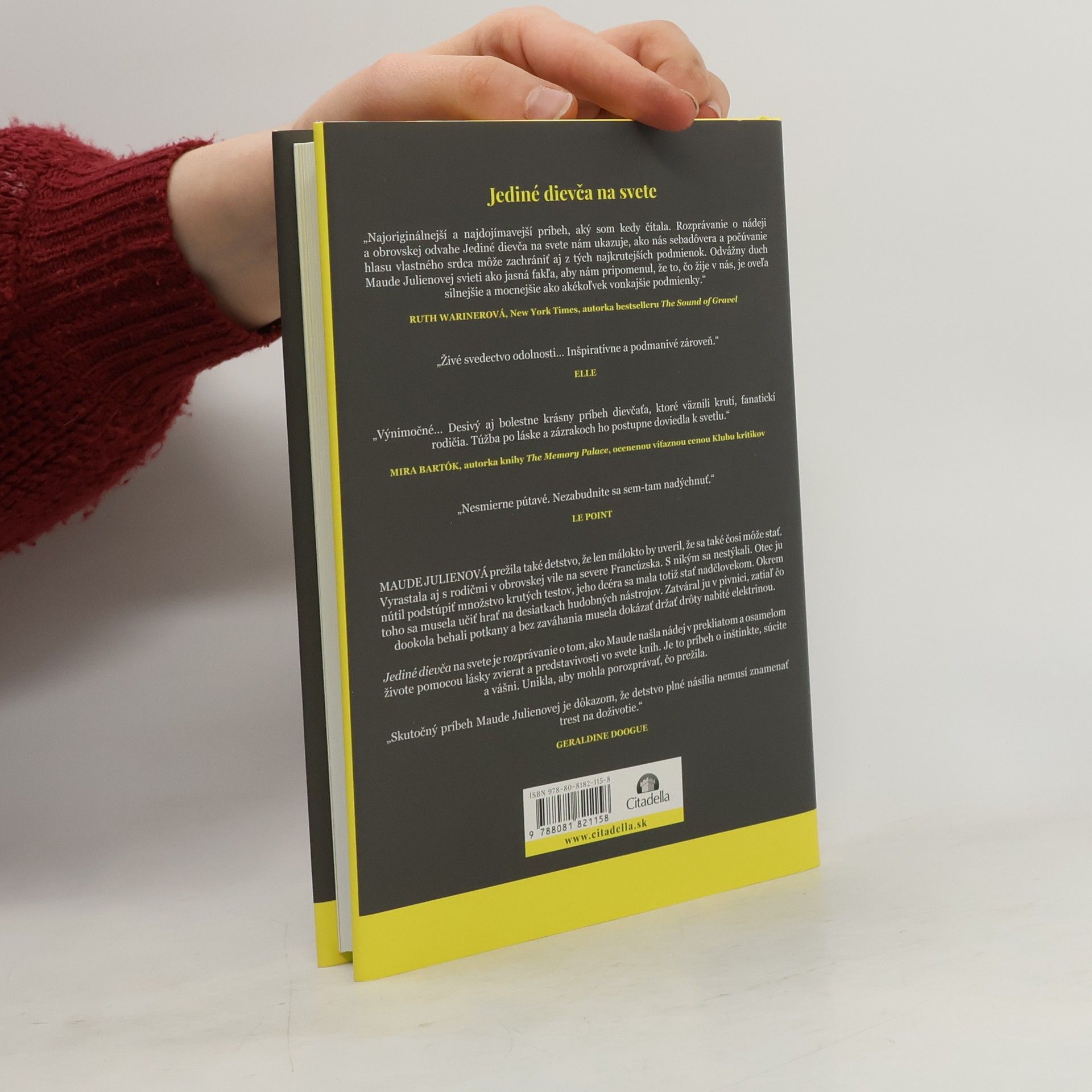 Maude Julienová prežila také detstvo, že len málokto by uveril, že sa také čosi môže stať. Vyrastala aj s rodičmi v obrovskej vile na severe Francúzska. S nikým sa nestýkali. Otec ju nútil podstúpiť množstvo krutých testov, jeho dcéra sa mala totiž stať nadčlovekom. Okrem toho sa musela učiť hrať na desiatkach hudobných nástrojov. Zatváral ju v pivnici, zatiaľ čo dookola behali potkany a bez zaváhania musela dokázať držať drôty nabité elektrinou. Jediné dievča na svete je rozprávanie o tom, ako Maude našla nádej v prekliatom a osamelom živote pomocou lásky zvierat a predstavivosti vo svete kníh. Je to príbeh o inštinkte, súcite a vášni. Unikla, aby mohla porozprávať, čo prežila.