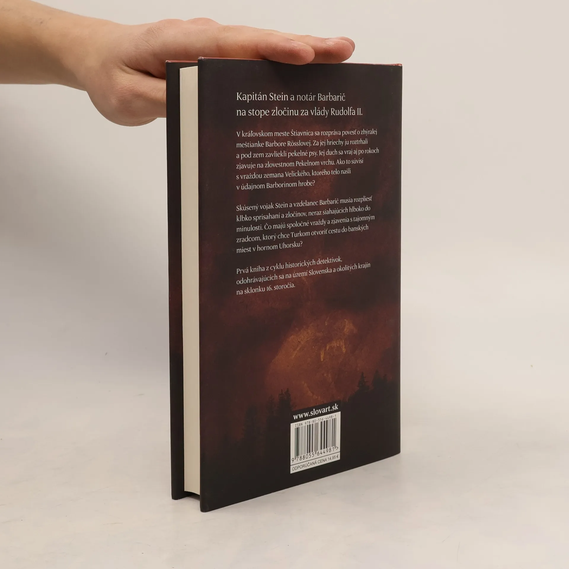 Historická detektívka. Prvý prípad kapitána Steina a notára Barbariča, ktorí sú na stope zločinu v habsburskom cisárstve za vlády Rudolfa II. Na konci 16. storočia zúri v kresťanskom pohraničí vojna s Osmanskou ríšou. Turci sa pokúšajú preniknúť k bohatým banským mestám v hornom Uhorsku. Vojnového veterána Steina vyšlú do Štiavnice odhaliť zradcu, ktorý sa chystá nepriateľom ukázať tajnú cestu do dobre opevneného mesta. Pátranie ešte skomplikuje vražda miestneho šľachtica. Stein musí spojiť sily s mestským notárom Matejom Barbaričom, aby rozplietol klbko sprisahaní a zločinov, z ktorých mnohé siahajú hlboko do minulosti. Zdá sa, že všetko súvisí so zlorečeným Pekelným vrchom - mnohí veria, že sa na ňom zjavuje duch zhýralej meštianky, a po nociach sa tam rozlieha vytie psov, čo strážia bránu do záhrobia. Druhé vydanie.