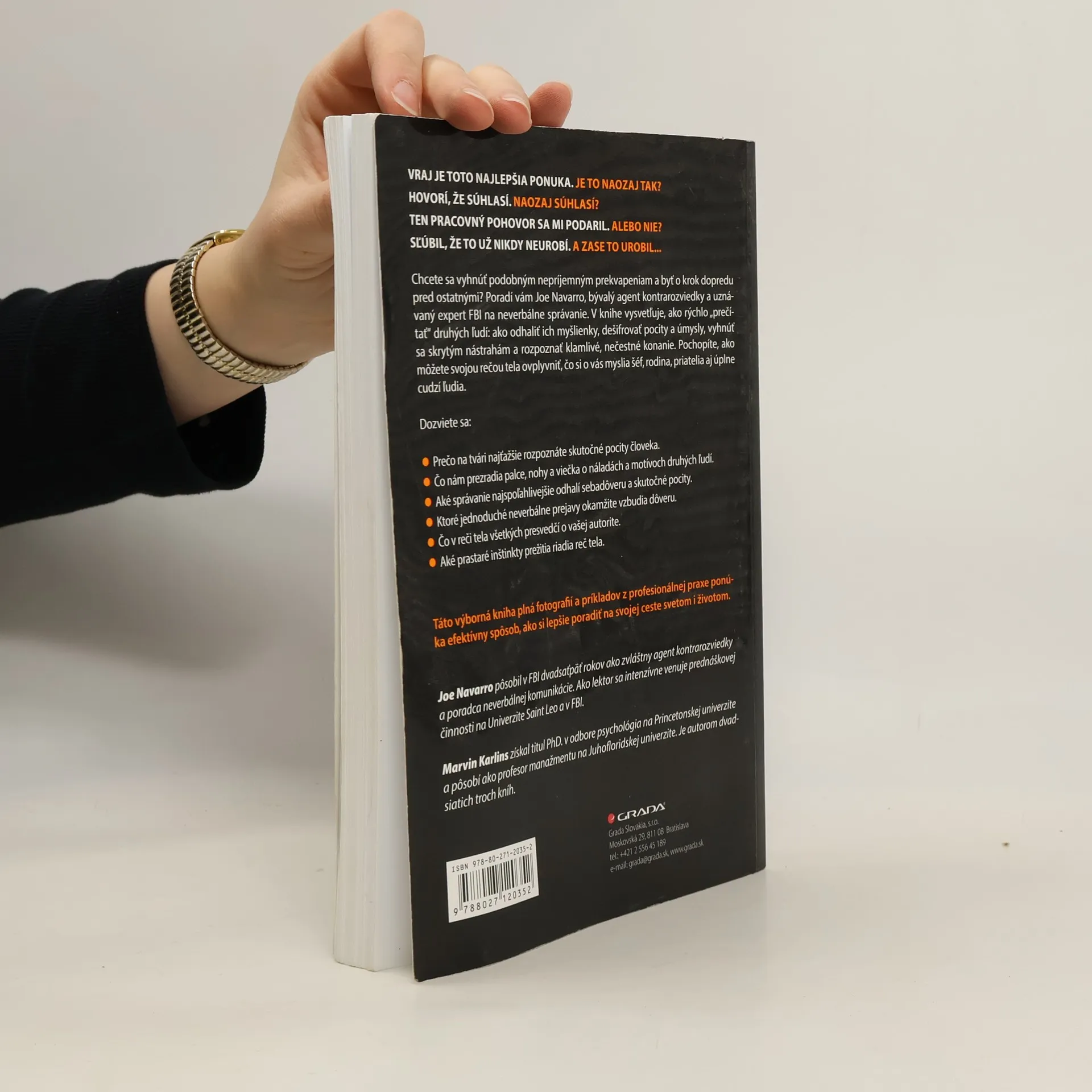 Vraj je toto najlepšia ponuka. Je to naozaj tak? Hovorí, že súhlasí. Naozaj súhlasí? Ten pracovný pohovor sa mi podaril. Alebo nie? Sľúbil, že to už nikdy neurobí. A zase to urobil... Chcete sa vyhnúť podobným nepríjemným prekvapeniam a byť o krok dopredu pred ostatnými? Poradí vám Joe Navarro, bývalý agent kontrarozviedky a uznávaný expert FBI na neverbálne správanie. V knihe vysvetľuje, ako rýchlo „prečítať“ druhých ľudí: ako odhaliť ich myšlienky, dešifrovať pocity a úmysly, vyhnúť sa skrytým nástrahám a rozpoznať klamlivé, nečestné konanie. Pochopíte, ako môžete svojou rečou tela ovplyvniť, čo si o vás myslia šéf, rodina, priatelia aj úplne cudzí ľudia.