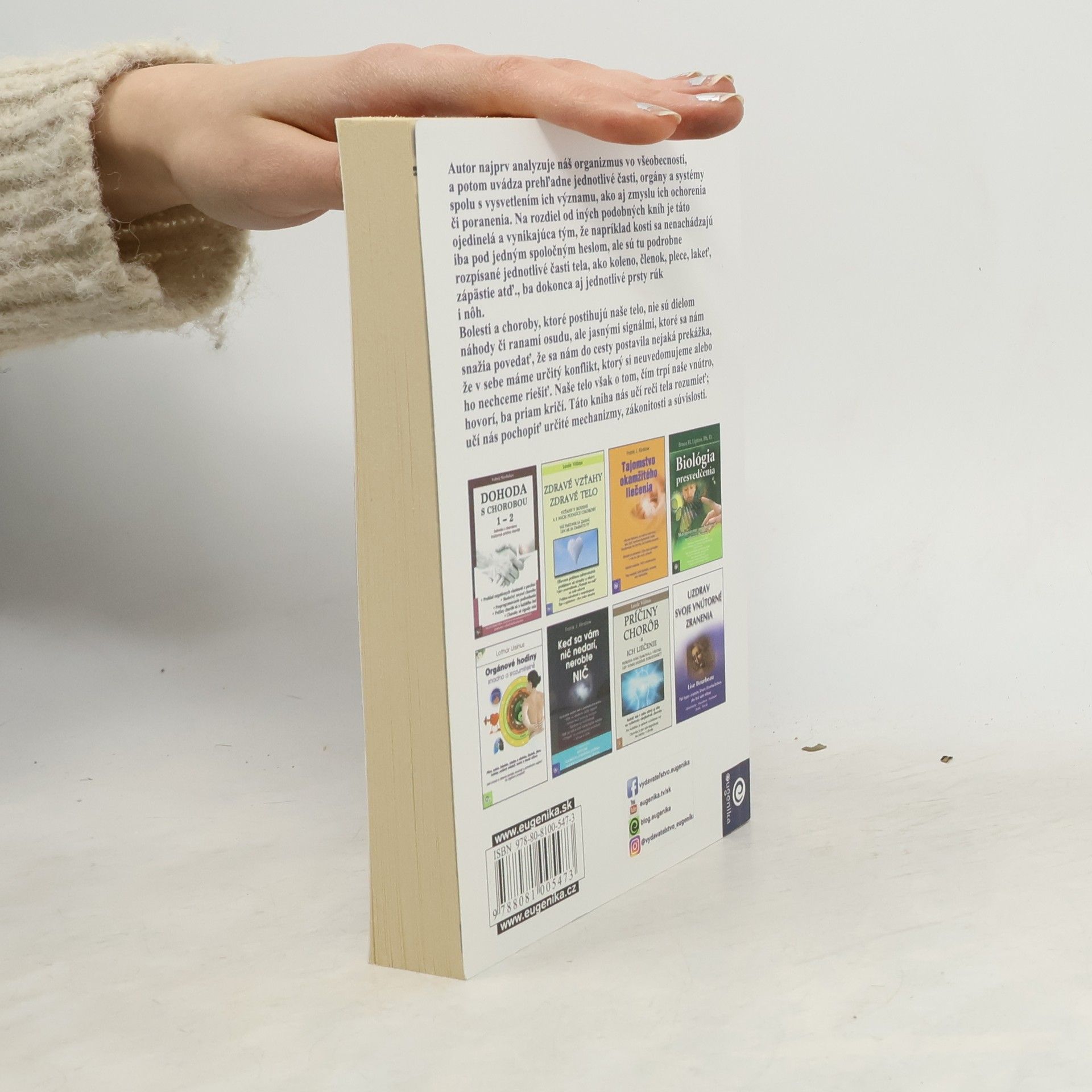 Autor vychádza najmä z tradičnej čínskej medicíny. Najprv analyzuje náš organizmus vo všeobecnosti, a potom uvádza prehľadne jednotlivé časti, orgány a systémy spolu s vysvetlením ich významu, ako aj významu v prípade ich ochorenia či poranenia. Alergie, bolesti v krku, zápaly, cysty, bolesti krížov, migréna, bolesti uší, nadváha, ischias, kŕče, závraty, očné choroby, rakovina a mnohé iné – to všetko sú prejavy väčšieho či menšieho napätia, nesúladu, nerovnováhy, nevedomého rozporu či potláčaného konfliktu, ktorý vedome nevnímame, alebo možno aj vnímame, ale nechceme sa ním zaoberať, a tak nás naň upozorňuje naše vlastné telo. Naše telo hovorí (ba priam kričí) o tom, čím trpí naše vnútro. A táto kniha nás učí tejto reči tela rozumieť. Učí nás pochopiť určité mechanizmy, zákonitosti a súvislosti. Bolesti a choroby, ktoré postihujú naše telo, nie sú dielom náhody či ranami osudu, ale jasnými signálmi, ktoré sa nám snažia povedať, že sa nám do cesty postavila nejaká prekážka. Keď sa naučíme vnímať človeka (vrátane seba samých) ako jeden celok, kde všetko súvisí so všetkým, zistíme, že väzby a spojitosti medzi telom, telesnými orgánmi a ich funkciou na jednej strane a psychikou na strane druhej nie sú žiadna mágia, ba ani ezoterika, ale že ide o čisto biologické vyjadrenie nášho stavu. Kľúčom k tomuto pochopeniu je aj táto publikácia.