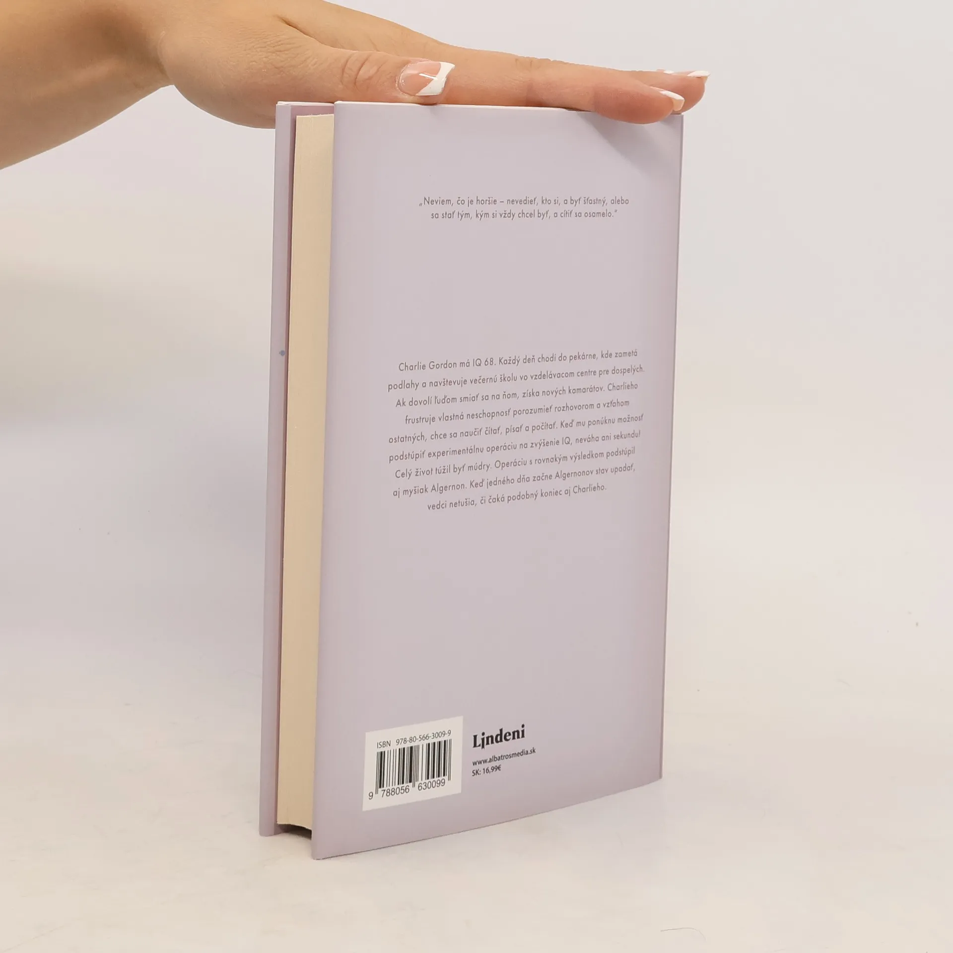 Podstúpili by ste experimentálnu operáciu na zvýšenie IQ? „Bojím sa. Nie života či smrti, ani ničoty, ale toho, že svoj čas premárnim, akoby som nikdy nebol.“ Charlie Gordon má IQ 68. Každý deň chodí do pekárne, kde zametá podlahy a navštevuje večernú školu vo vzdelávacom centre pre dospelých. Ak dovolí ľuďom smiať sa na ňom, získa nových kamarátov. Charlieho frustruje vlastná neschopnosť porozumieť rozhovorom a vzťahom ostatných, chce sa naučiť čítať, písať a počítať. Keď mu ponúknu možnosť podstúpiť experimentálnu operáciu na zvýšenie IQ, neváha ani sekundu! Celý život túžil byť múdry. Rovnakú operáciu s rovnakým výsledkom podstúpil aj myšiak Algernon. Keď jedného dňa začne Algernonov stav upadať, vedci netušia, či čaká podobný koniec aj Charlieho. Kultový román druhej polovice 20. storočia, ktorý dnes právom považujeme za klasiku americkej literatúry.