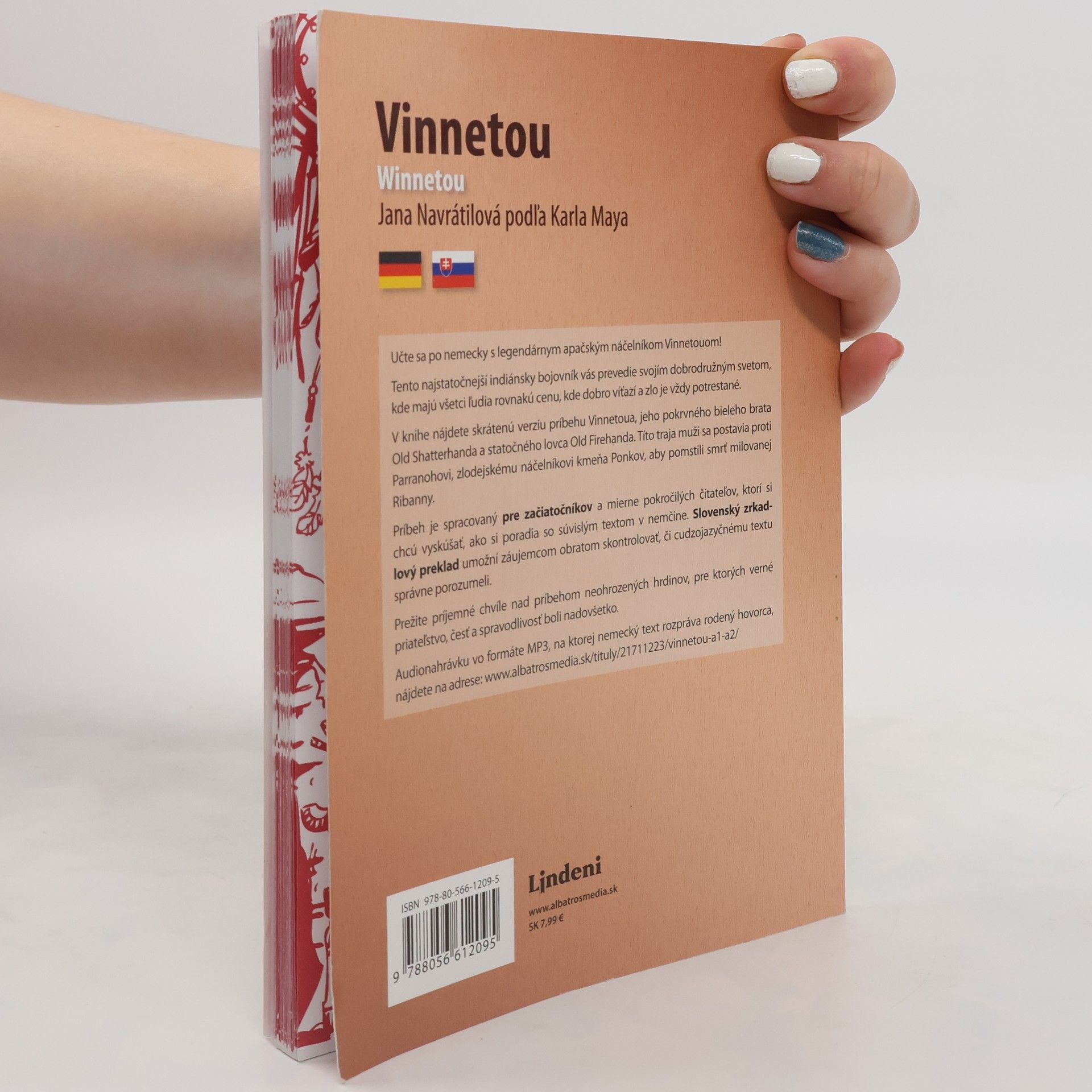 Učte sa po nemecky s legendárnym apačským náčelníkom Vinnetouom!Dvojjazyčná kniha pre začiatočníkov Pre výučbu upravila Jana Navrátilová Učte sa po nemecky s legendárnym apačským náčelníkom Vinnetouom! Tento najstatočnejší indiánsky bojovník vás prevedie svojím dobrodružným svetom, kde majú všetci ľudia rovnakú cenu, kde dobro víťazí a zlo je vždy potrestané. V knihe nájdete skrátenú verziu príbehu Winnetoua, jeho pokrvného bieleho brata Old Shatterhanda a statočného lovca Old Firehanda. Títo traja muži sa postavia proti Parranohovi, zlodejskému náčelníkovi kmeňa Ponkov, aby pomstili smrť milovanej Ribanny. Príbeh je spracovaný pre začiatočníkov a mierne pokročilých čitateľov, ktorí si chcú vyskúšať, ako si poradia so súvislým textom v nemčine. Slovenský zrkadlový preklad umožní záujemcom obratom skontrolovať, či cudzojazyčnému textu správne porozumeli. Prežite príjemné chvíle nad príbehom neohrozených hrdinov, pre ktorých verné priateľstvo, česť a spravodlivosť boli nadovšetko. Audionahrávku vo formáte MP3, na ktorej nemecký text rozpráva rodený hovorca, nájdete na adrese