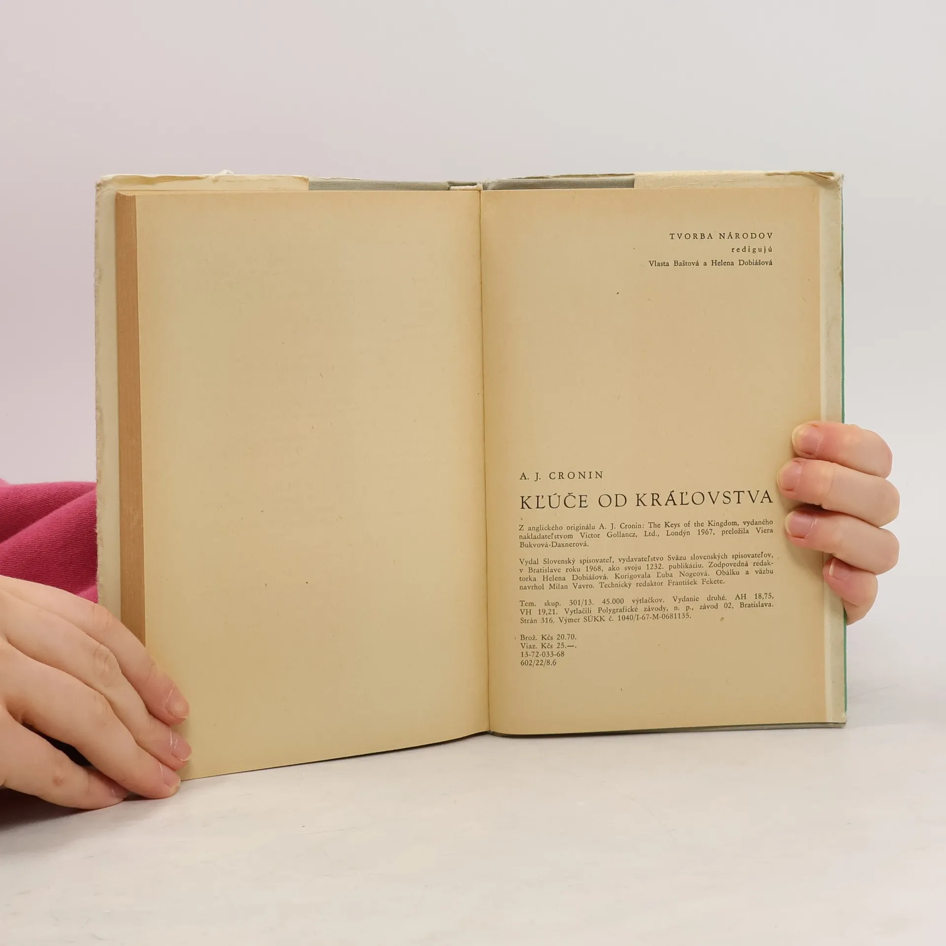 Archibald Joseph CRONIN, známy anglický románopisec, narodený roku 1896 v Škótsku, nie je pôvodným povolaním spisovateľ, ale lekár. Spočiatku pracoval v niekoľkých nemocniciach, potom si otvoril v Južnom Walese súkromnú prax a r. 1924 sa stal zdravotným inšpektorom anglických baní. Sám fáraldo vyše päťsto baní, aby preskúmal tamojšie zdravotné pomery a ochranné zariadenia. Svoje smutné skúsenosti z tohto obdobia spomína v románe Citadela, v diele, ktoré neskôr založilo autorovi svetovú slávu. Croninov kritický tón z Citadely sa však v románe Kľúče od kráľovstva zmenil na zhovievavý a chápavý. Šľachetný misionár Francis Chisholm hľadá v ľuďoch krásu a dobrotu srdca, neposudzuje veriacich podľa príslušnosti k tej či onej cirkvi, lež podľa ich vlastností a skutkov. Pravda, nestretáva sa vždy s pochopením tých, čo lipnú na slove a forme, a dostane sa mu odsúdenia aj od vlastných predstavených, no na druhej strane milujú ho a ctia si ho všetci trpiaci a utláčaní, ľudia jednoduchí a úbohí. Kľúče od kráľovstva sú pre misionára kľúčmi k ľudskej duši a k raju tu na zemi — a dostanú ich všetci, ktorí nie slovami, ale činmi bojujú za to, aby bolo čo najmenej chudobných a nešťastných. Takéto je krédo románu, ktorý svojho času patril k najprekladanejším a najčítanejším anglickým dielam a ktorý vyšiel po vojne aj v slovenčine. Veríme, že naši čitatelia opäť uvítajú nové vydanie tohto úspešného románu od úspešného spisovateľa.