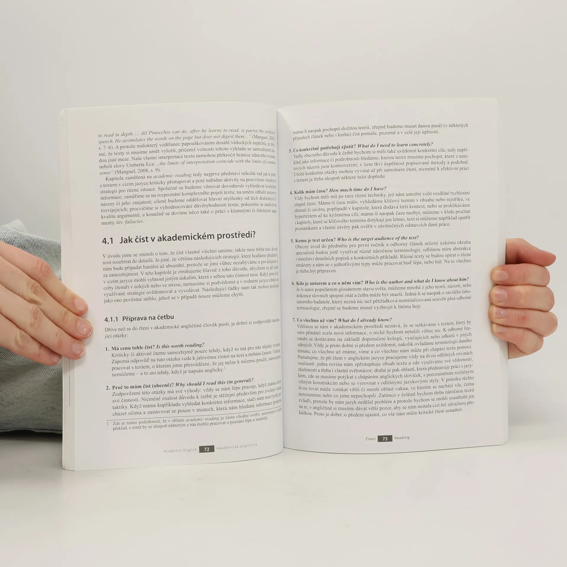 Na trhu ojedinělá publikace přináší komplexní přehled základních dovedností "akademické angličtiny" a představuje studijní materiál určený čtenářům, kteří se pohybují v prostředí světa vysokého školství i vědy a kteří se musí samostatně vzdělávat v anglickém jazyce (s výjimkou studentů anglické filologie). Kniha přístupnou a zajímavou formou představuje zvláštnosti akademického jazyka, vysvětluje podstatu základních jazykových i měkkých dovedností, na jejichž kvalitě často závisí úspěch v daném oboru, a současně také nabízí škálu aktivit, s jejichž pomocí lze představené kompetence lépe ovládnout a procvičit. Každá z tematických kapitol v knize nejprve česky vysvětluje specifika zvolených dovedností v rámci akademického a vědeckého prostředí spolu s jejich odlišnostmi od českého jazyka a na tuto část navazuje mnoho zajímavých cvičení a aktivit v angličtině, které mimo jiné odpovídají úrovni B2 a C1 Společného evropského referenčního rámce pro jazyky. Česko-anglická publikace poslouží zejména akademikům a studentům vysokých škol jako obecný průvodce, praktický manuál a výchozí pramen k základní orientaci v anglickém jazyce v prostředí vysokého školství a vědy.