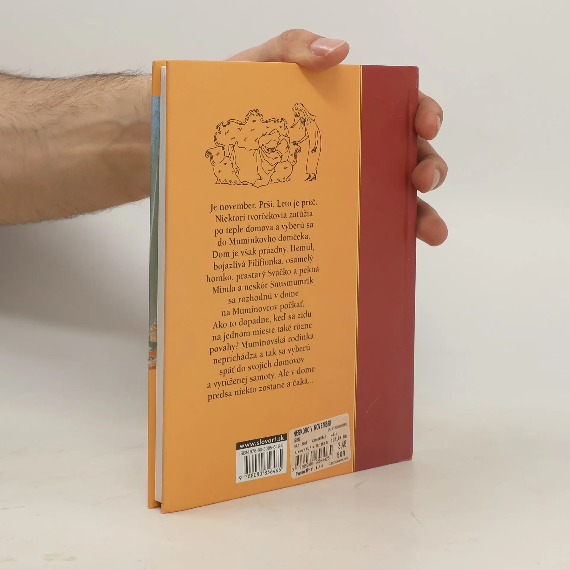 Je november. Prší. Leto je preč. Niektorí tvorčekovia zatúžia po teple domova a vyberú sa do Mumintrollovho domčeka. Dom je však prázdny. Hemul, bojazlivá Filifionka, osamelý homko, prastarý Sváčko a pekná Mimla a neskôr aj Snusmumrik sa rozhodnú v dome na Muminovcov počkať. Ako to dopadne, keď sa zídu na jednom mieste také rôzne povahy? Návštevníci sa nevedia Muminovskej rodinky dočkať, a tak sa vyberú späť do svojich domovov a vytúženej samoty. Ale v dome predsa niekto zostane a čaká...