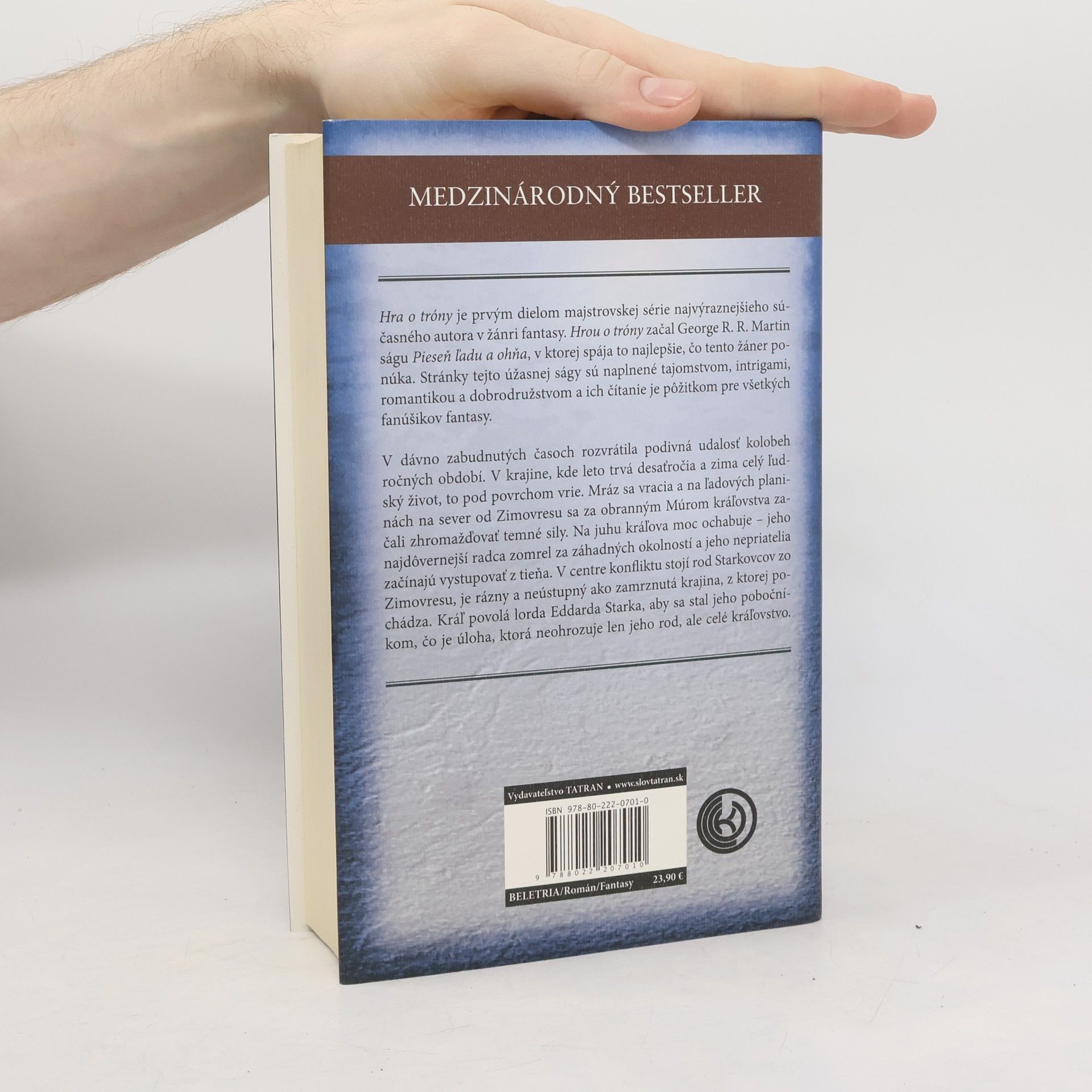 Hra o tróny rozpráva príbeh, ktorý prechádza z krutej krajiny ľadu do letného kráľovstva epikurejského bohatstva, kde sa rozpletajú osudy lordov a dám, vojakov a čarodejníkov, vrahov a zloduchov, stretávajúce sa v časoch zlovestných znamení. Záhadná skupina bojovníkov s mečmi z neznámeho kovu, kmeň divochov, privádzajúci ľudí do šialenstva, krutý dračí princ, ktorý vymení svoju sestru za trón, dieťa strácajúce sa v súmraku medzi životom a smrťou a odhodlaná žena, ktorá sa vydáva na zradnú cestu, aby ochránila všetko, čo je jej drahé. Uprostred celého tohto diania, príbehov plných tragédií aj zrady, spojencov aj nepriateľov visí osud rodu Starkovcov na vlásku. Z každej strany čelia útokom a snažia sa zvíťaziť v najkrutejšej z bitiek – v hre o tróny.