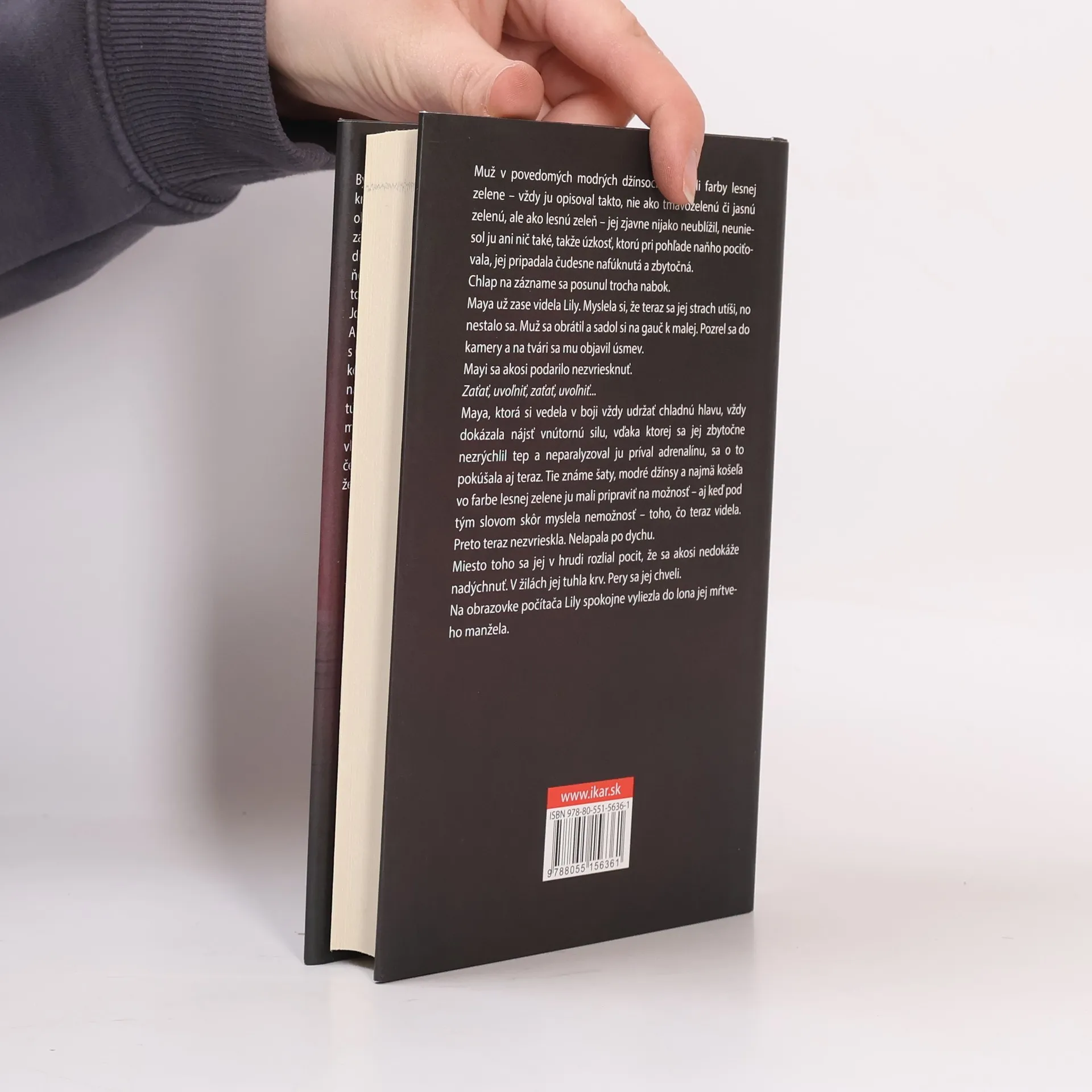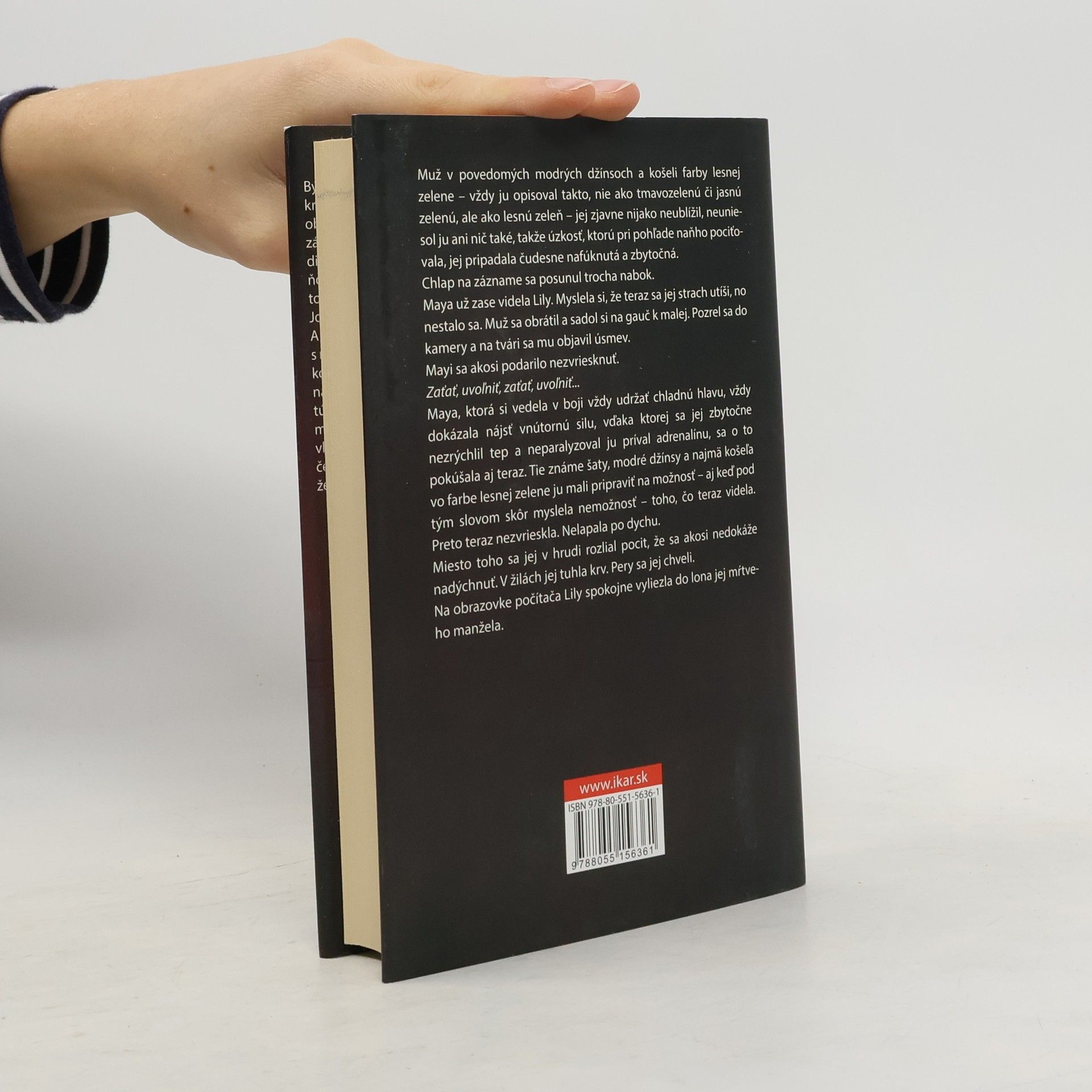 Muž v povedomých modrých džínsoch a košeli farby lesnej zelene – vždy ju opisoval takto, nie ako tmavozelenú či jasnú zelenú, ale ako lesnú zeleň – jej zjavne nijako neublížil, neuniesol ju ani nič také, takže úzkosť, ktorú pri pohľade naňho pociťovala, jej pripadala čudesne nafúknutá a zbytočná. Chlap na zázname sa posunul trocha nabok. Maya už zase videla Lily. Myslela si, že teraz sa jej strach utíši, no nestalo sa. Muž sa obrátil a sadol si na gauč k malej. Pozrel sa do kamery a na tvári sa mu objavil úsmev. Mayi sa akosi podarilo nezvriesknuť. Zaťať, uvoľniť, zaťať, uvoľniť... Maya, ktorá si vedela v boji vždy udržať chladnú hlavu, vždy dokázala nájsť vnútornú silu, vďaka ktorej sa jej zbytočne nezrýchlil tep a neparalyzoval ju príval adrenalínu, sa o to pokúšala aj teraz. Tie známe šaty, modré džínsy a najmä košeľa vo farbe lesnej zelene ju mali pripraviť na možnosť – aj keď pod tým slovom skôr myslela nemožnosť – toho, čo teraz videla. Preto teraz nezvrieskla. Nelapala dych. Miesto toho sa v hrudi rozlial pocit, že sa akosi nedokáže nadýchnuť. V žilách jej tuhla krv. Pery sa jej chveli. Na obrazovke počítača Lily spokojne vyliezla do lona jej mŕtveho manžela.
