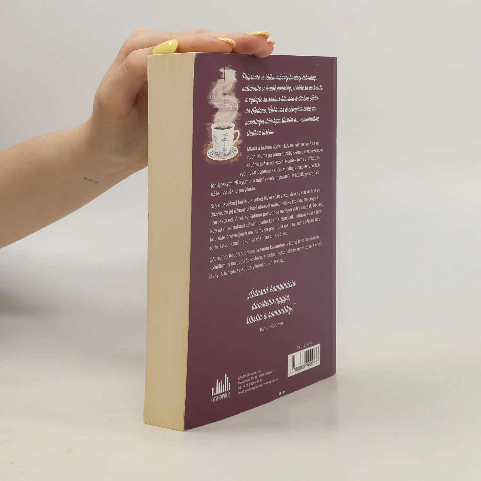 Pripravte si šálku voňavej horúcej čokolády, natiahnite si hrubé ponožky, schúľte sa do kresla a vydajte sa spolu s hlavnou hrdinkou Katie do Kodane. Čaká vás prekvapivá cesta za povestným dánskym šťastím a. .. romantickou sladkou láskou. Mladá a krásna Katie nikdy nemala ustlané na ružiach. Mama jej zomrela príliš skoro a otec nezvládol situáciu práve najlepšie. Napriek tomu si dokázala vybudovať úspešnú kariéru v jednej z najprestížnejších londýnskych PR agentúr a nájsť skvelého priateľa. K šťastiu jej chýbalo už len vytúžené povýšenie. Sny o úspešnej kariére a veľkej láske však zrazu visia na vlásku, keď sa dozvie, že jej úžasný priateľ ukradol nápad, vďaka ktorému ho povýšili namiesto nej. A tak sa Katinou poslednou nádejou stáva cesta do Kodane, kde sa musí pokúsiť získať nového klienta. Spočiatku otravný výlet s hŕstkou ešte otravnejších novinárov sa postupne mení na jedno úžasne dobrodružstvo, ktoré nakoniec všetkým zmení život. Očarujúca Kodaň s jednou úžasnou kaviarňou, v ktorej to vonia škoricou, koláčikmi a horúcou čokoládou, v ľuďoch totiž dokáže znova zapáliť oheň lásky. A tentoraz nebude výnimkou ani Katie. ..