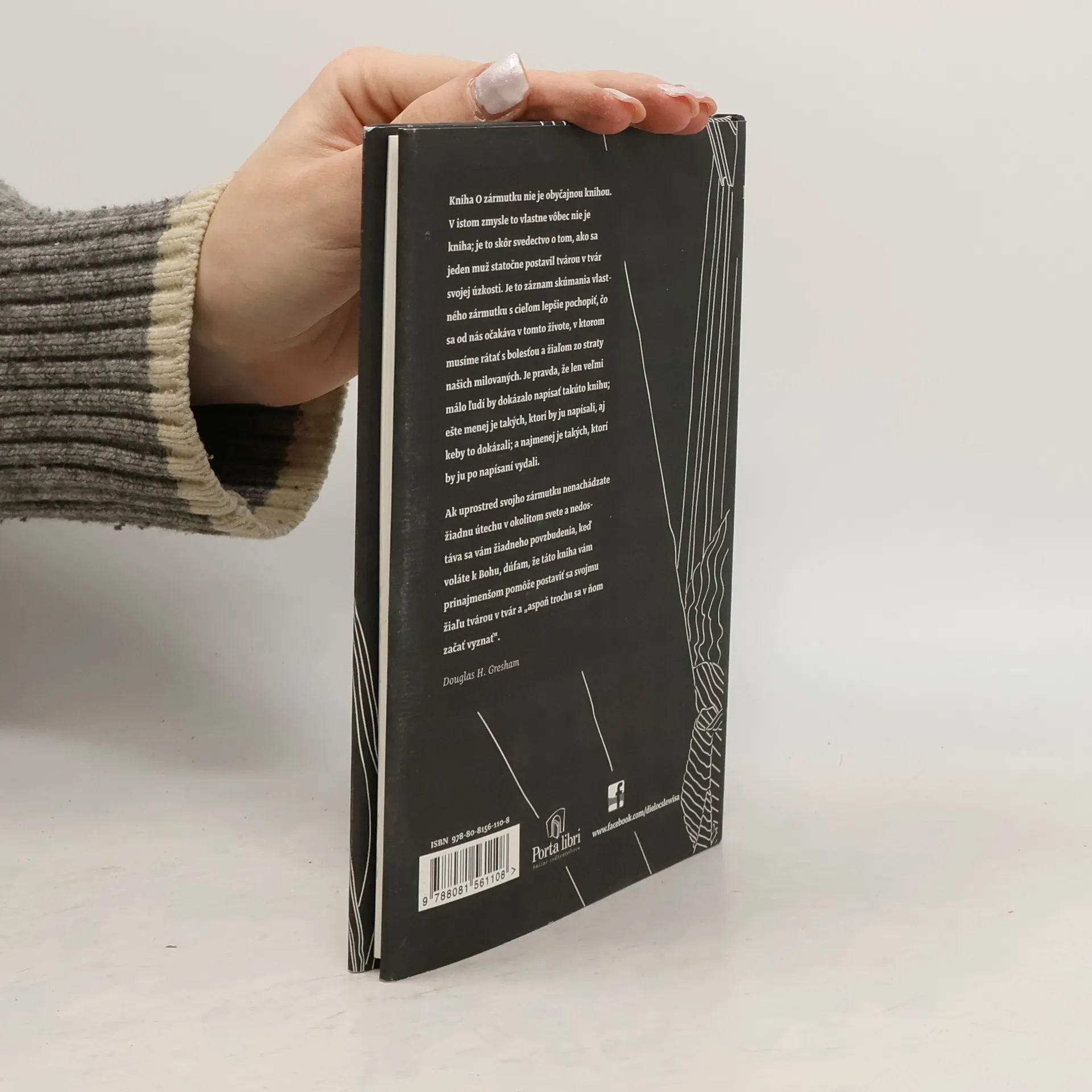 Kniha O zármutku nie je obyčajnou knihou. V istom zmysle to vlastne vôbec nie je kniha; je to skôr svedectvo o tom, ako sa jeden muž statočne postavil tvárou v tvár svojej úzkosti. Je to záznam skúmania vlastného zármutku s cieľom lepšie pochopiť, čo sa od nás očakáva v tomto živote, v ktorom musíme rátať s bolesťou a žiaľom zo straty našich milovaných. Je pravda, že len veľmi málo ľudí by dokázalo napísať takúto knihu; ešte menej je takých, ktorí by ju napísali, aj keby to dokázali; a najmenej je takých, ktorí by ju po napísaní vydali. Ak uprostred svojho zármutku nenachádzate žiadnu útechu v okolitom svete a nedostáva sa vám žiadneho povzbudenia, keď voláte k Bohu, dúfam, že táto kniha vám prinajmenšom pomôže postaviť sa svojmu žiaľu tvárou v tvár a „aspoň trochu sa v ňom začať vyznať“. Douglas H. Gresham