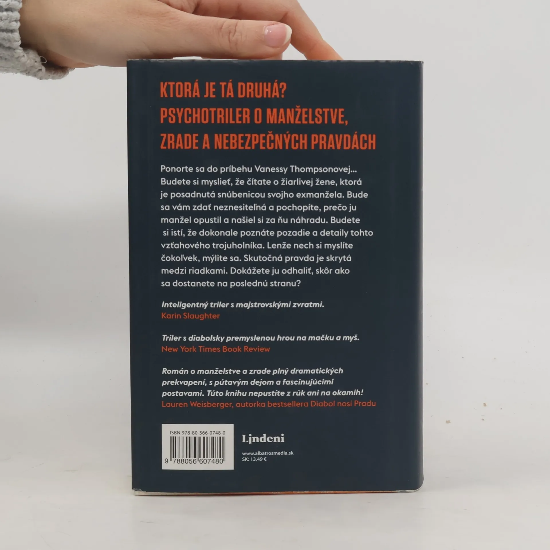 Psychologický thriller o manželstve, zrade a nebezpečných pravdách, ktoré sa skrývajú medzi riadkami. KTORÁ JE TÁ DRUHÁ? Ponorte sa do príbehu Vanessy Thompsonovej... Budete si myslieť, že čítate o žiarlivej žene, ktorá je posadnutá snúbenicou svojho exmanžela. Bude sa vám zdať neznesiteľná a pochopíte, prečo ju manžel opustil a našiel si za ňu náhradu. Budete si istí, že dokonale poznáte pozadie a detaily tohto vzťahového trojuholníka. Lenže nech si myslíte čokoľvek, mýlite sa. Skutočná pravda sa skrýva medzi riadkami. Dokážete ju odhaliť, skôr ako sa dostanete na poslednú stranu?