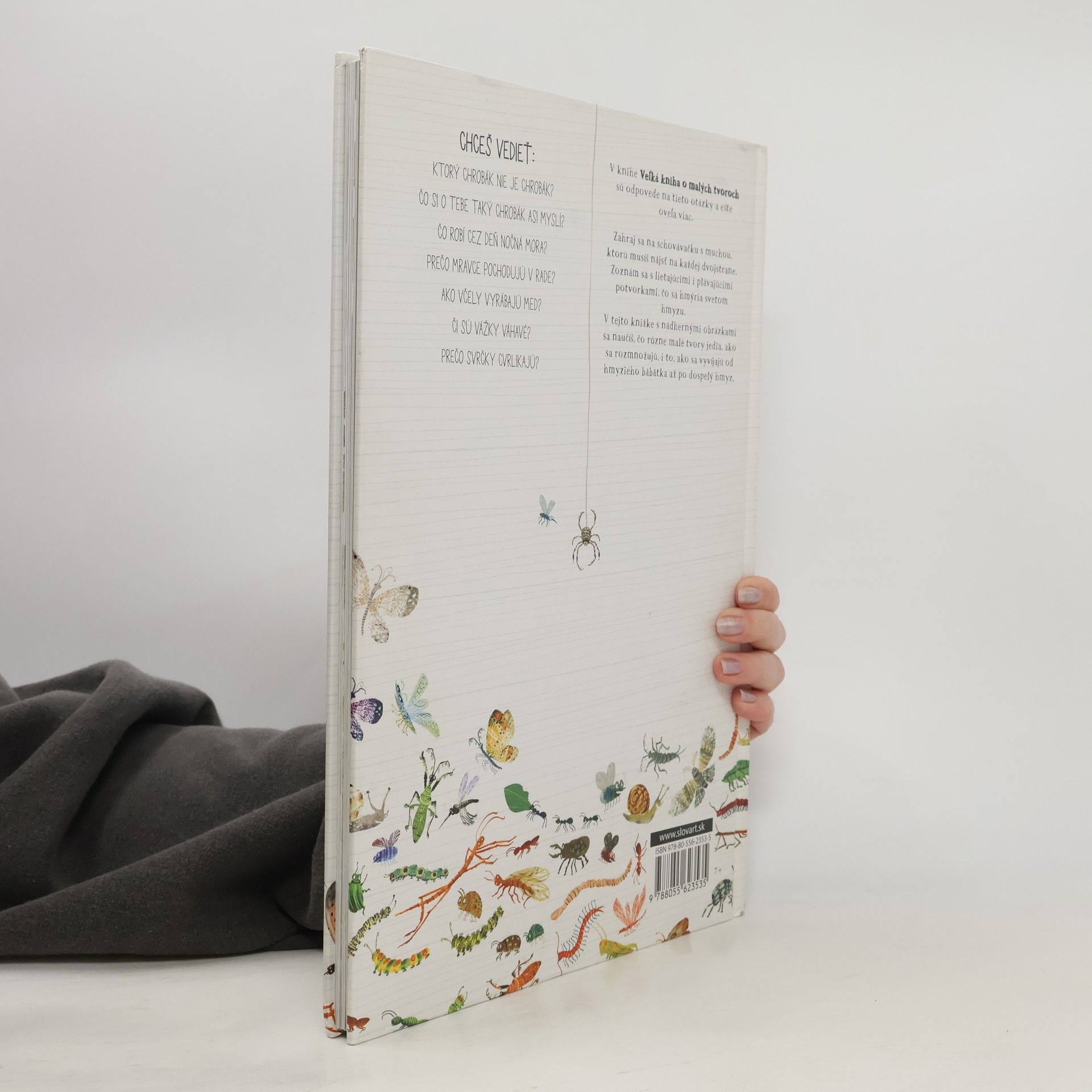 V knihe Veľká kniha o malých tvoroch sa deti zoznámia s lietajúcimi i plávajúcimi potvorkami, čo sa hmýria svetom hmyzu. Dočítajú sa, čo jedia, ako sa rozmnožujú i to, ako sa vyvíjajú od hmyzieho bábätka až po dospelý hmyz. Na stránkach plných nádherných obrázkov sa dozvedia, ktorý chrobák nie je chrobák, čo robí cez deň nočná mora, ako včely vyrábajú med, prečo svrčky cvrlikajú a ešte oveľa viac zaujímavostí zo života chrobákov, mušiek a iných potvoriek. Popritom sa zahrajú na schovávačku s muchou, ktorú musia nájsť na každej dvojstrane.